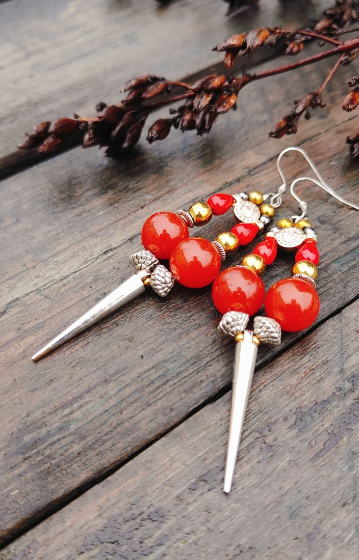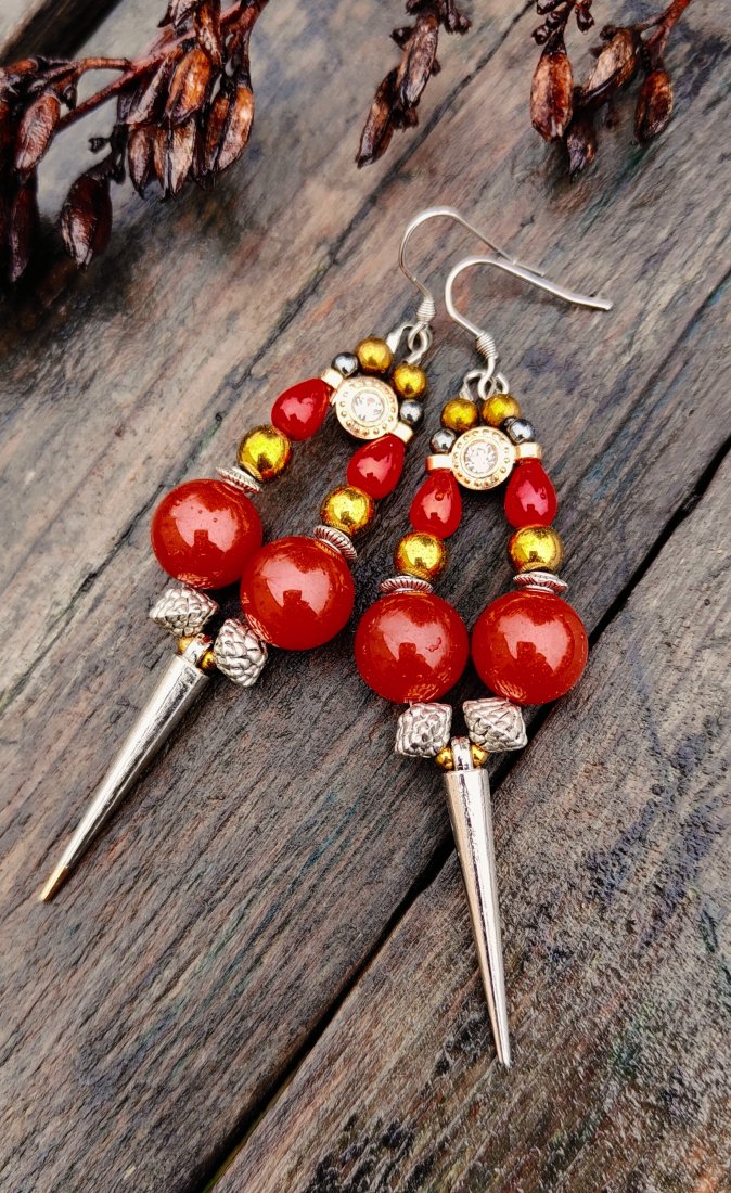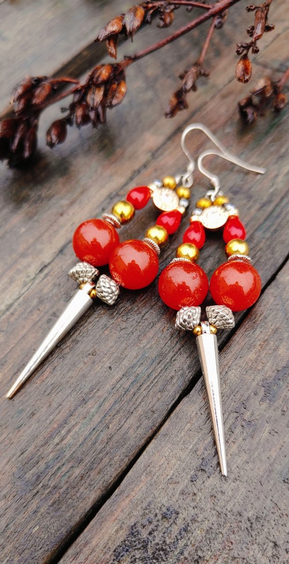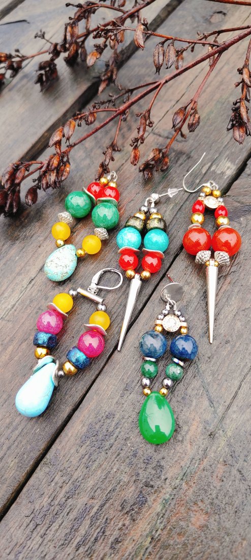 ,,kolec,, to kolorowe kolczyki wykonane z czerwonego marmuru, czarnego i złotego hematytu, szklistego jadeitu i metalowych elementów. Kolczyki zawieszone są na biglach wykonanych ze stali nierdzewnej.
