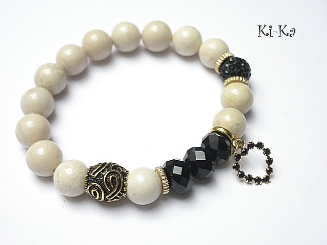 PROJEKT AUTORSKI. Bransoletka z kolekcji RICH charakteryzującej się wykorzystaniem w jednej bransoletce - mixu minerałów, kryształków, elementów ozdobnych, kryształków Swarovskiego, cyrkonii, przywieszek etc. . Model jest w sam sobie na tyle strojny, że nie wymaga uzupełnienia go dodatkowymi akcentami. Bransoletka wykonana z kamieni naturalnych - marmur [10mm], fasetowanych oponek kryształków [10mm] , zawieszki z metalu pokrytej srebrem pr. 925 [pozłacanej 18k złotem] i wysadzanej kryształkami Swarovskiego [Jet] 19 x 12mm], przekładki shamballa wysadzanej kryształkami Swarovskiego oraz elementów w kolorze złota. Bransoletka na gumce silikonowej. Pasuje na nadgarstek 15-16,5cm. Biżuteria ozdobnie zapakowana. Możliwość dopasowania bransoletki do nadgarstka - wcześniej prosimy o kontakt.