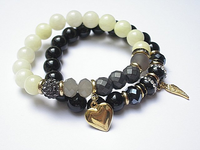 PROJEKT AUTORSKI. WSZELKIE INNE PODOBNE MODELE TO KOPIE NARUSZAJĄCE PRAWA AUTORSKIE. Komplet dwóch bransoletek kolekcji RICH charakteryzujących się wykorzystaniem w jednej bransoletce - mixu minerałów, kryształków, elementów ozdobnych, kryształków Swarovskiego, cyrkonii, przywieszek etc. . Model jest w sam sobie na tyle strojny, że nie wymaga uzupełnienia go dodatkowymi akcentami. Bransoletki wykonane z naturalnych kamieni - kuleczki jadeitów [10mm], fasetowanego hematytu [10mm], onyksu [10mm], onyksu wysadzanego cyrkoniami [10mm], kryształków [8 x 10mm], przekładki shamballa wysadzanej kryształkami Swarovskiego oraz elementów w kolorze złota. Bransoletki na gumce silikonowej. Pasują na nadgarstek 16-17cm -możliwość dopasowania. Biżuteria ozdobnie zapakowana.