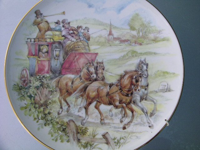 Porcelanowy Talerz Kolekconerski z ciekawym,malarskim zdobieniem. Sygnowany Koroną i Bone China Made in England. Magiczny Dyliżans mknie przed siebie delikatn/a kreską malowany...kolory subtelne,miłe dla oka.Na błyszcząco wykończony,rant złocony.. Z tyłu profesjonalny uchwyt do powieszenia.