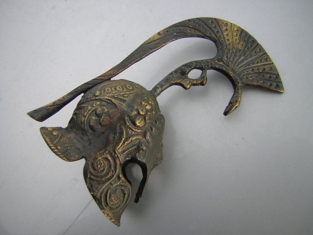 Kolekcjonerski metalowy, żeliwny dzwonek. Replika. Ciekawy, dobrze wykonany, nie sygnowany. Serce dzwonka metalowe. Dźwięk donośny, mocny. Ciężki. Wykończenie satynowo - matowe. Postarzany, lekko pozłacany. Szer. 9 x około 5,5 cm wys. 13,5 Stan zachowania bardzo dobry. Ciekawa rzecz do kolekcji I na oryginalny prezent;)