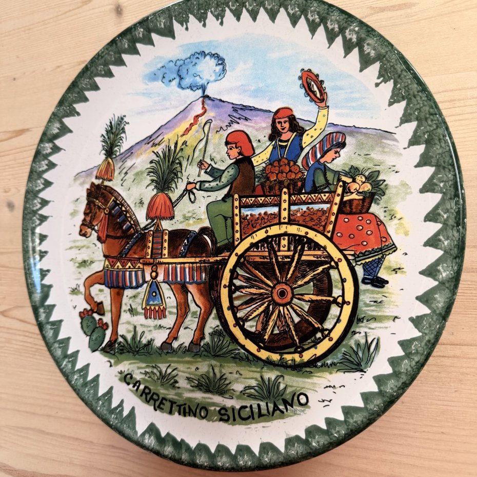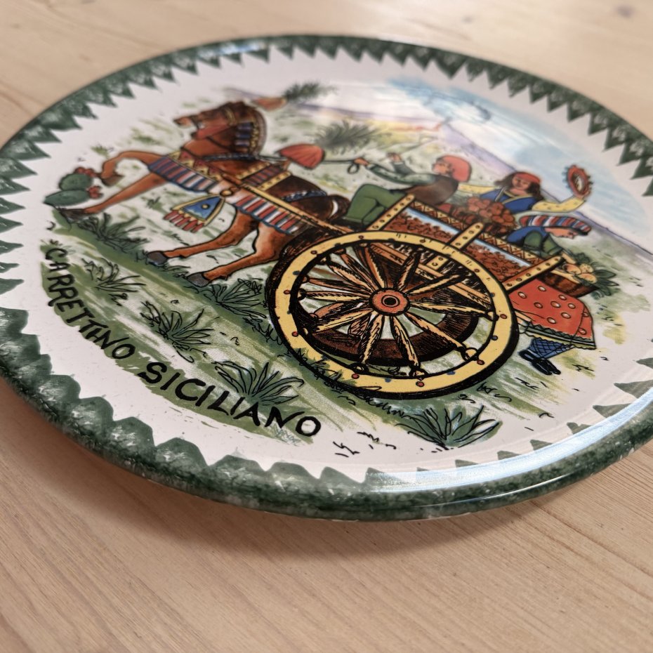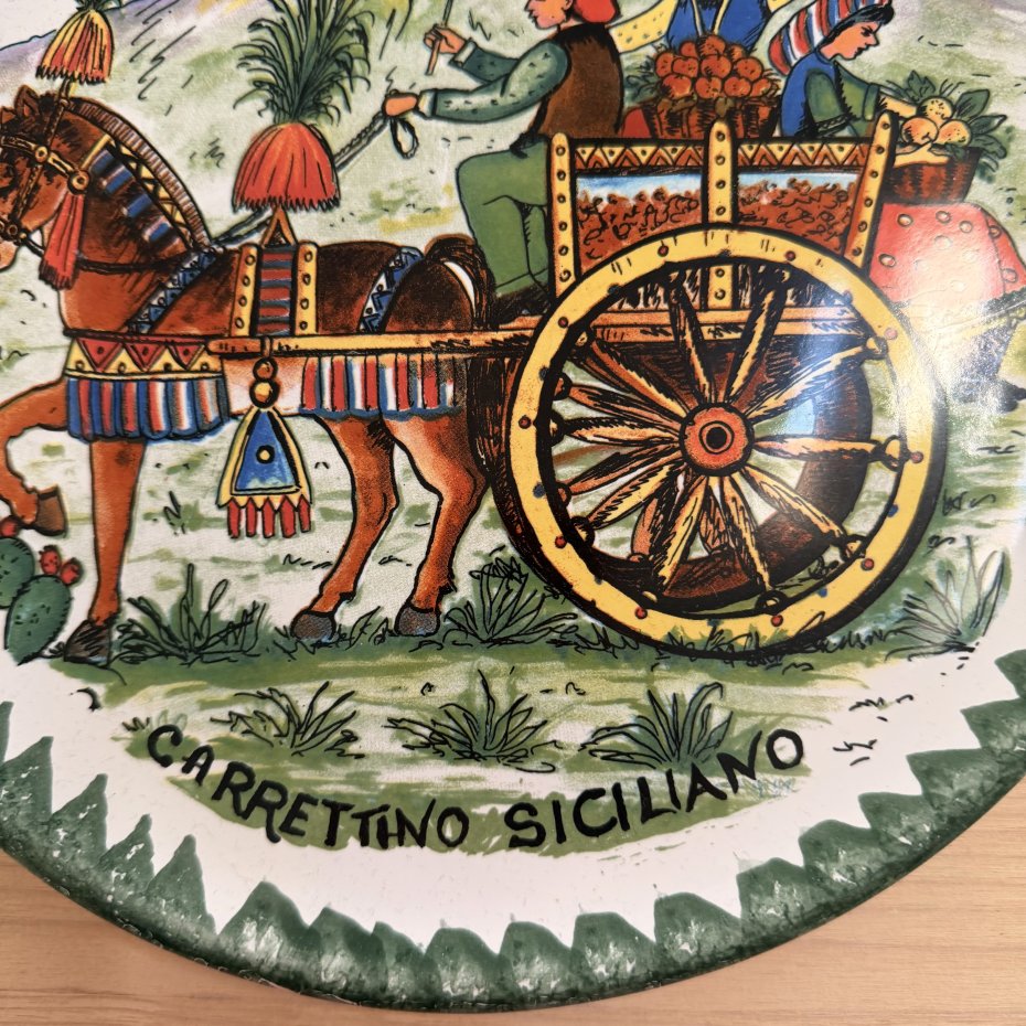Duży średnica 27 cm ręcznie malowany talerz sycylijski caretino siciliano - motyw charakterystyczny dla regionu . Kolekcjonerski stary