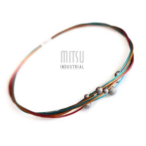Jesienna kolia, wykonana ze stalowych linek pokrytych nylonem oraz metalowych teksturowanych kul. Zapięcie na magnes. Długość: ok 50 cm. Naszyjnik podróżuje ładnie zapakowany. Polecam! Można do kompletu zakupić bransoletę dostępną osobno. Aby zamówić inna długość naszyjnika proszę o info w opcjach wyboru.