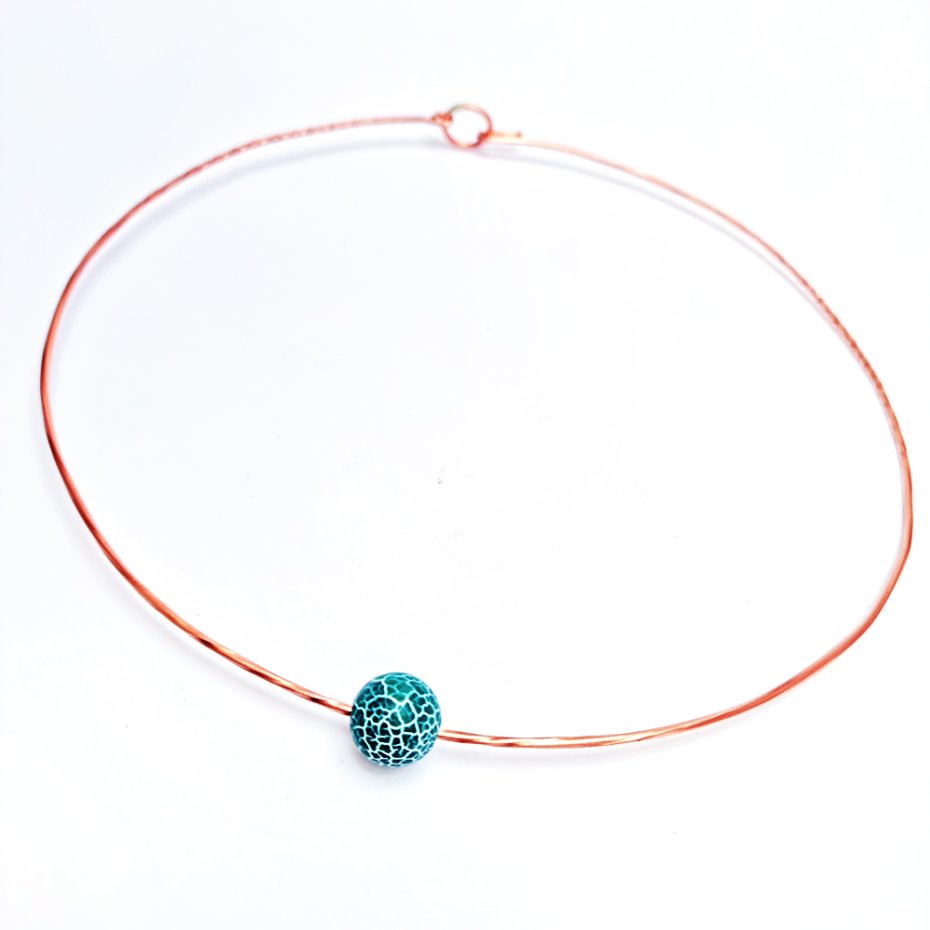 Kolia wykonana z drutu fi 2 mm z czystej polskiej miedzi z kulką fi 11,5mm trawionego agatu w kolorze zielonkawym. Drut walcowany i skręcany dla nadania mu sprężystości. Ręczne kształtowanie i przecieranie.