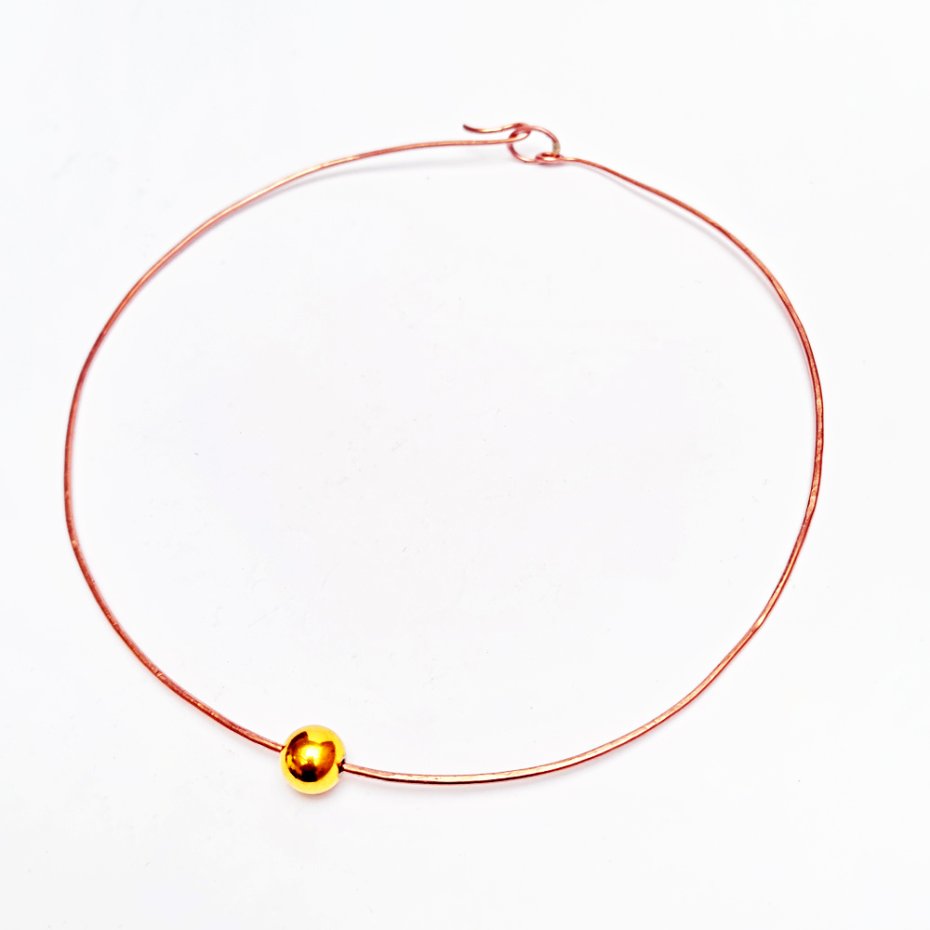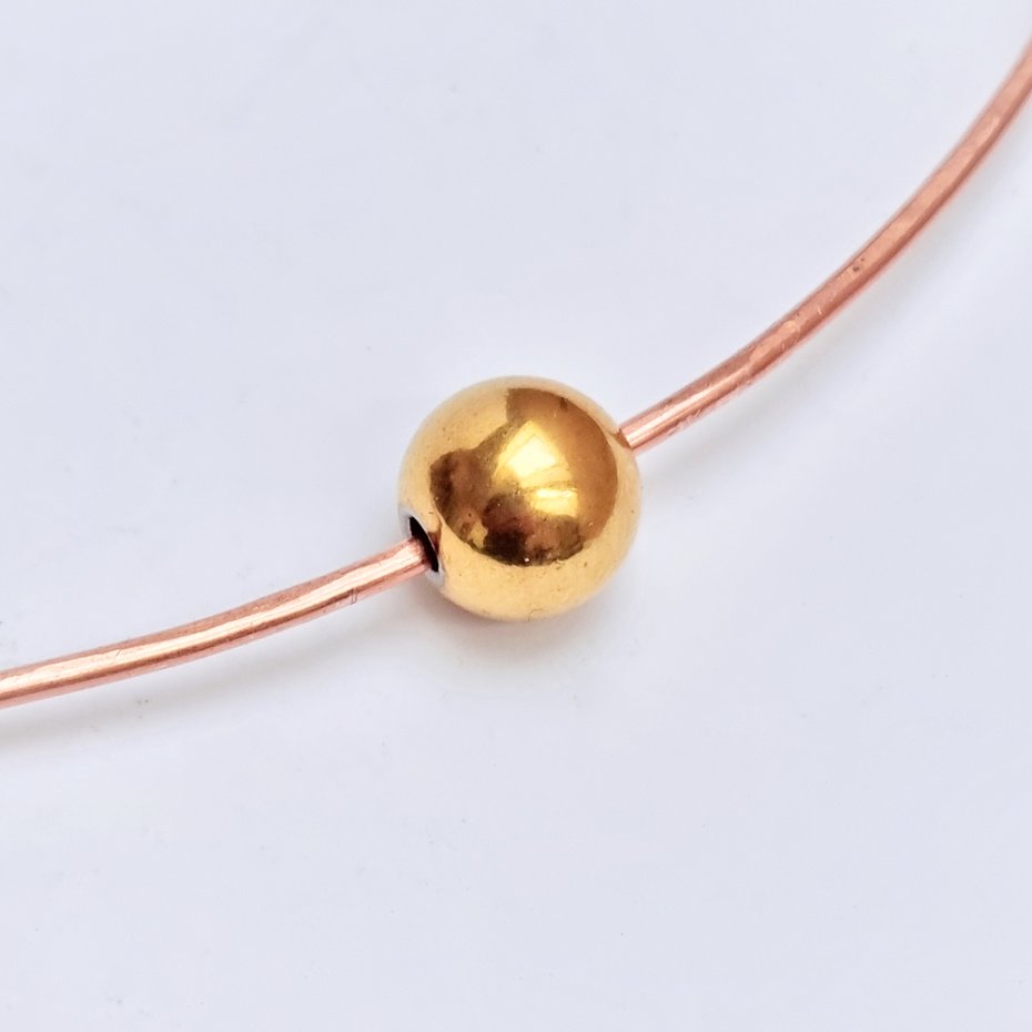 Kolia wykonana z drutu fi 1,5mm z czystej polskiej miedzi z pozłacaną kulką fi 10mm ze stali szlachetnej. Drut kuty młotkiem dla uzyskania odpowiedniej sprężystości. Ręczne kształtowanie i przecieranie.