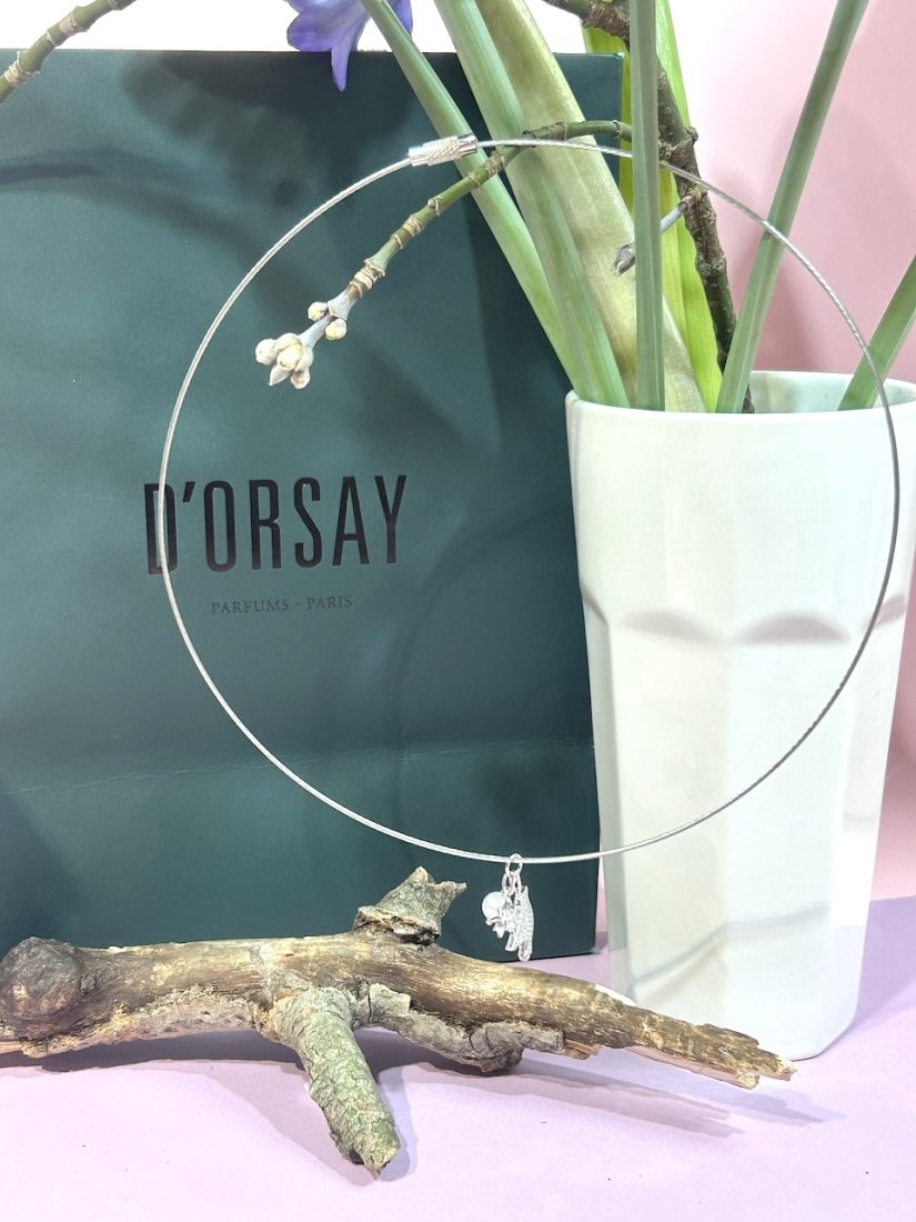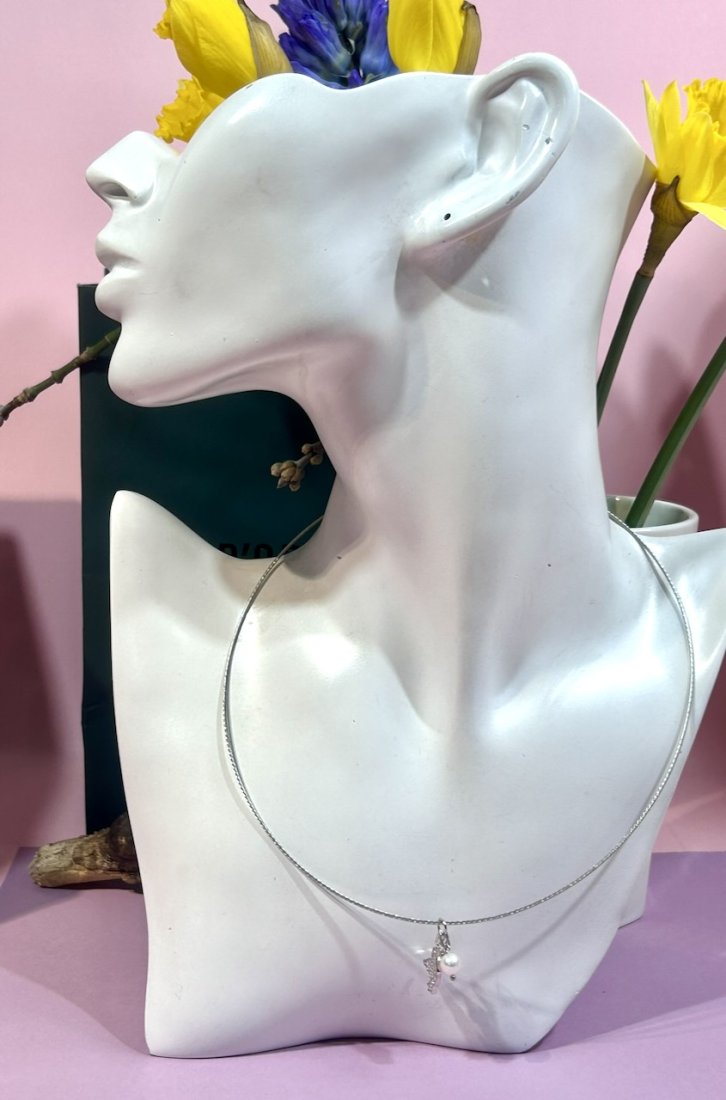 Delikatna kolia, wykonana z linki jubilerskiej z dyskretnym zakręcanym zapięciem. Ma formę choker - blisko przy szyi.