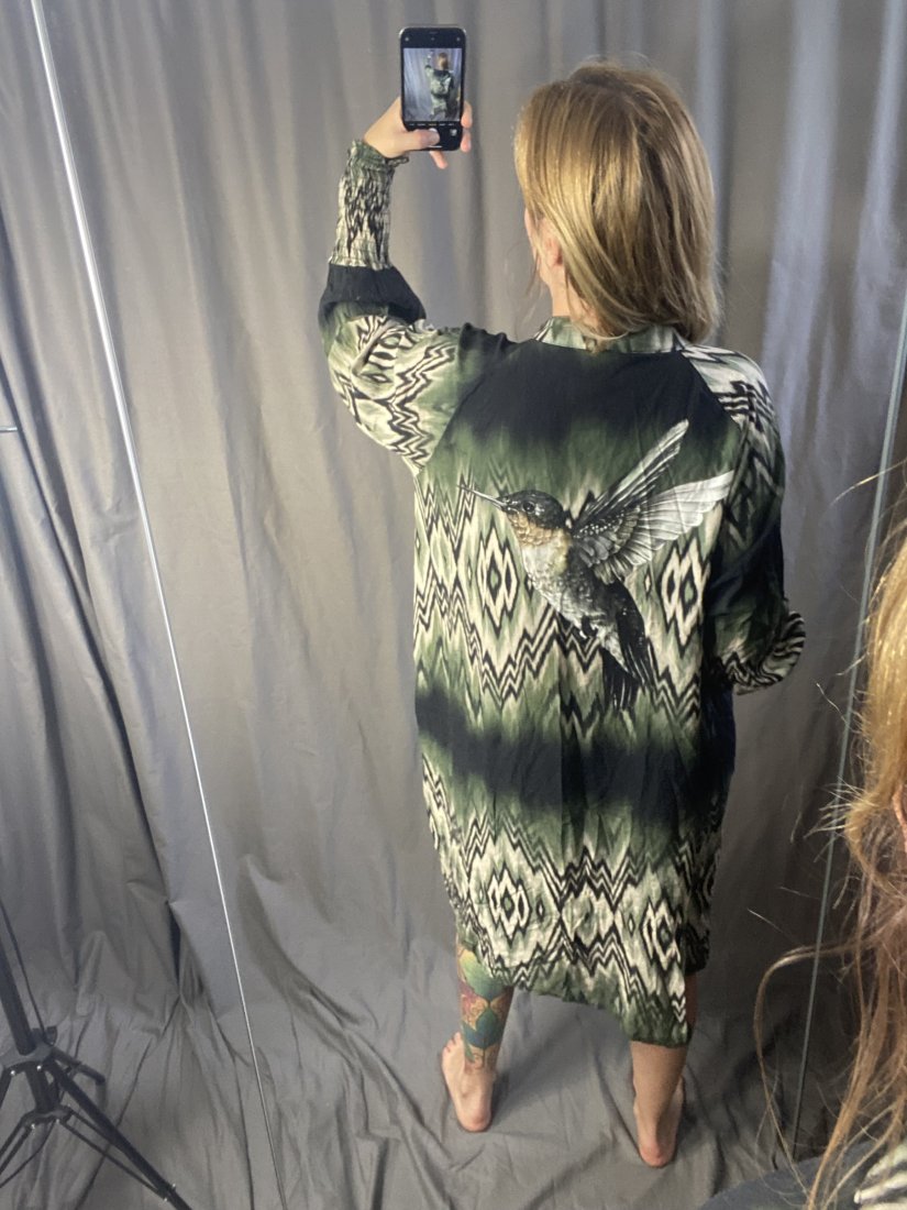 Przepiękna sukienka z wiskozy. Marki Marta. Z kolibrem. Rękawy zakończone ściągaczmi.