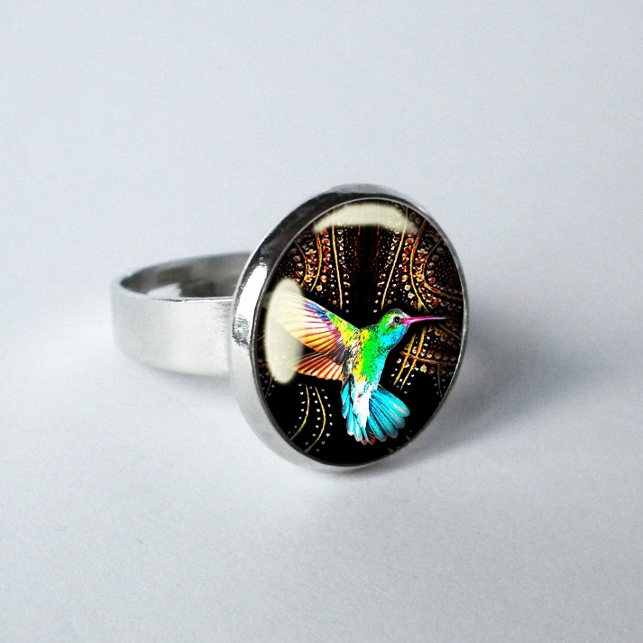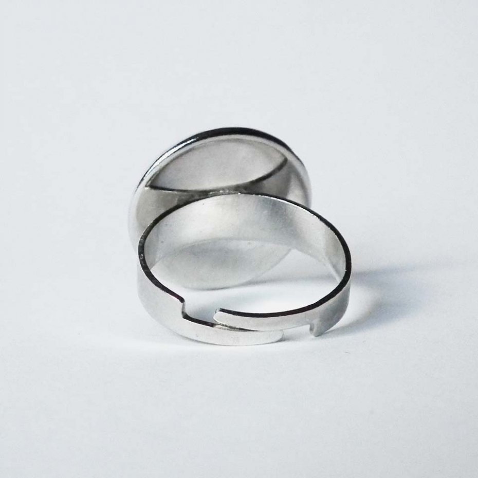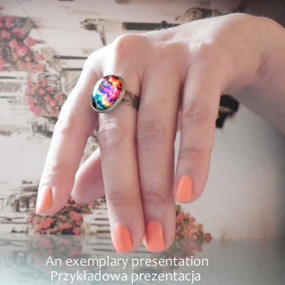 Oryginalny, nieduży pierścionek z okrągłym oczkiem z unikatową grafiką artystyczną, umieszczoną pod szklanym kaboszonem (wypukłym szkiełkiem) i oprawioną w bazę w kolorze srebrnym (nie zawiera niklu i ołowiu, hipoalergiczna). Grafika jest najwyższej jakości, wywołana na wysokiej klasy papierze fotograficznym.