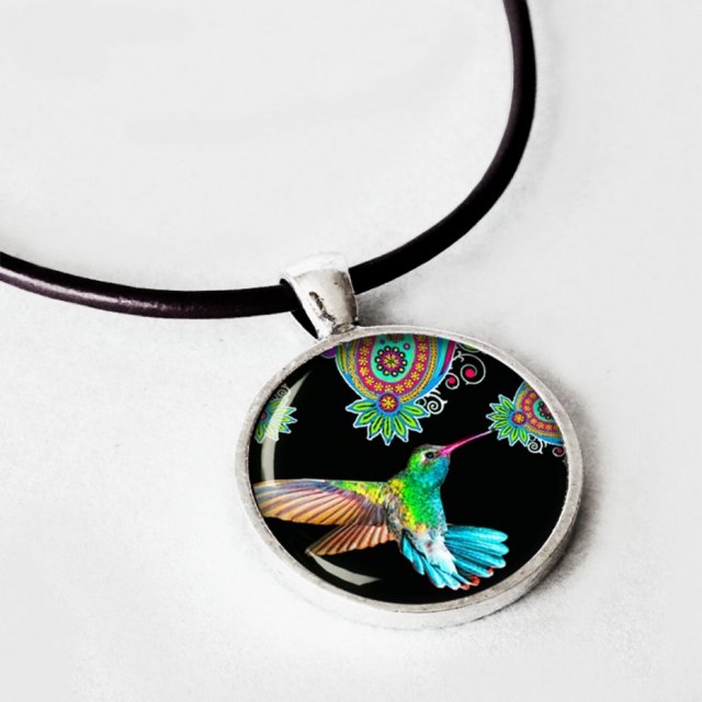 Unikatowy naszyjnik z wisiorem, zawieszonym na skórzanym czarnym rzemieniu jubilerskim. Motyw graficzny umieszczony jest za wypukłym szkłem - tzw. kaboszonem i oprawiony w bazę w kolorze srebra. Obrazek jest bardzo wyraźny, w intensywnych kolorach, wywołany na papierze foto. Oryginalne szklane kaboszony wykonane ręcznie według mojego projektu i przeze mnie, z dbałością o każdy detal.