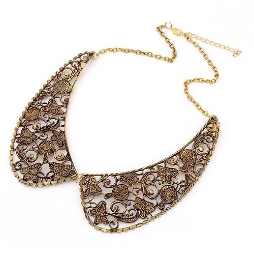 Bardzo modny naszyjnik-kołnierzyk z ażurowym wzorem. W kolorze starego złota/miedzi , nowy. Długość: 47 cm + możliwość przedłużenia o 4 cm