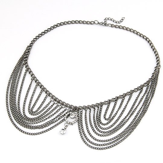 Bardzo modny naszyjnik-kołnierzyk utworzony z łańcuszków. W kolorze dosyć ciemnego srebra, nowy. Długość: 48 cm + możliwość przedłużenia o 5 cm.