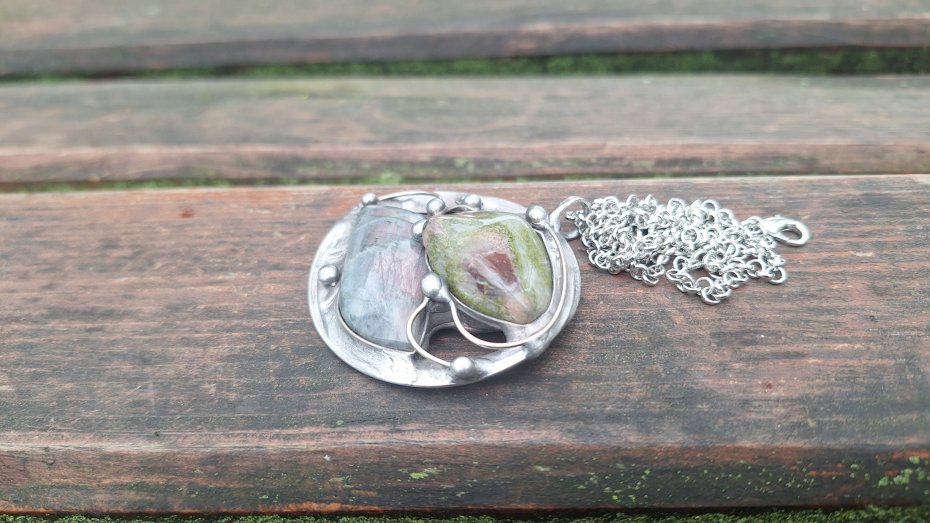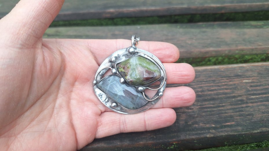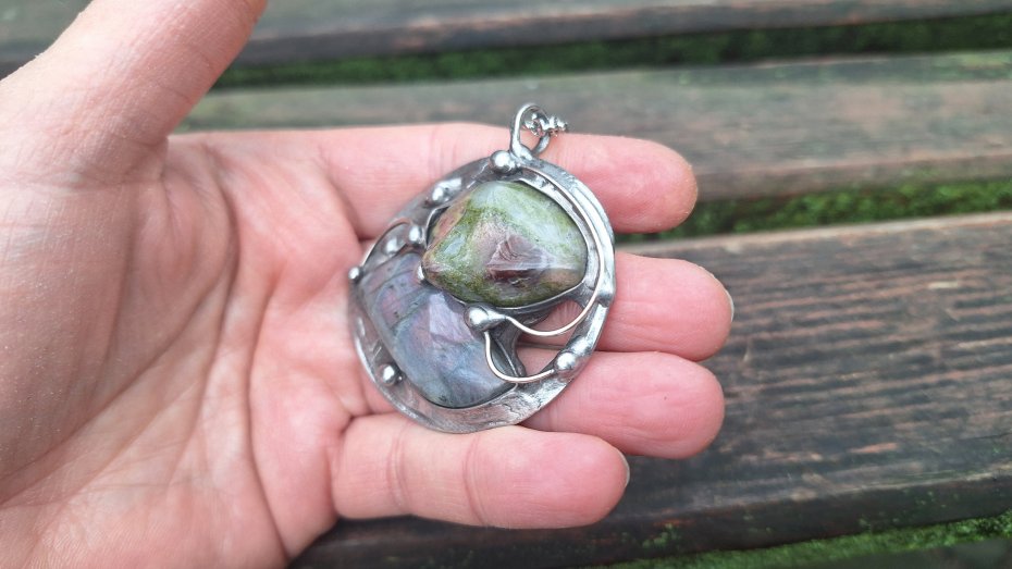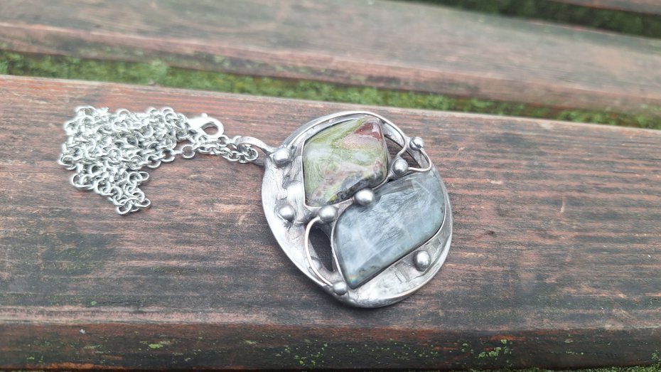 Wisiorek wykonany z miedzi, cyny, labradorytu i agatu. Wymiary ok. 5 na 5 cm. Zawieszony na łańcuszku o długości ok. 50 cm. Wykonany w jednym egzemplarzu.