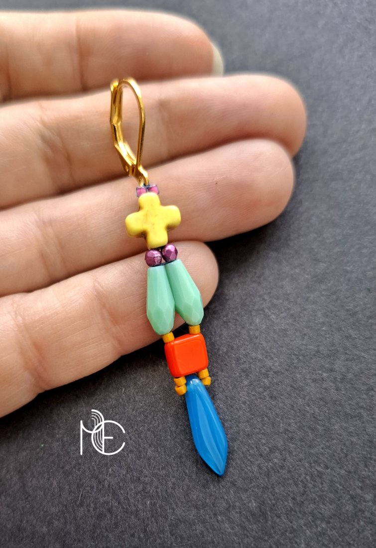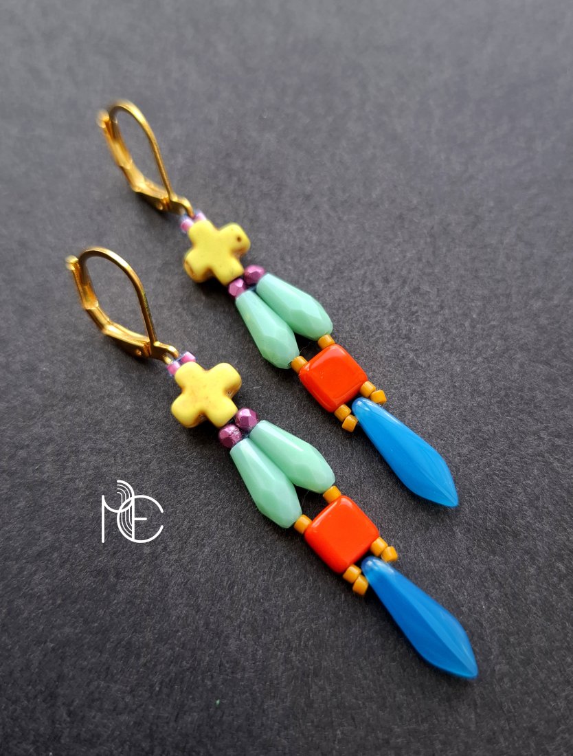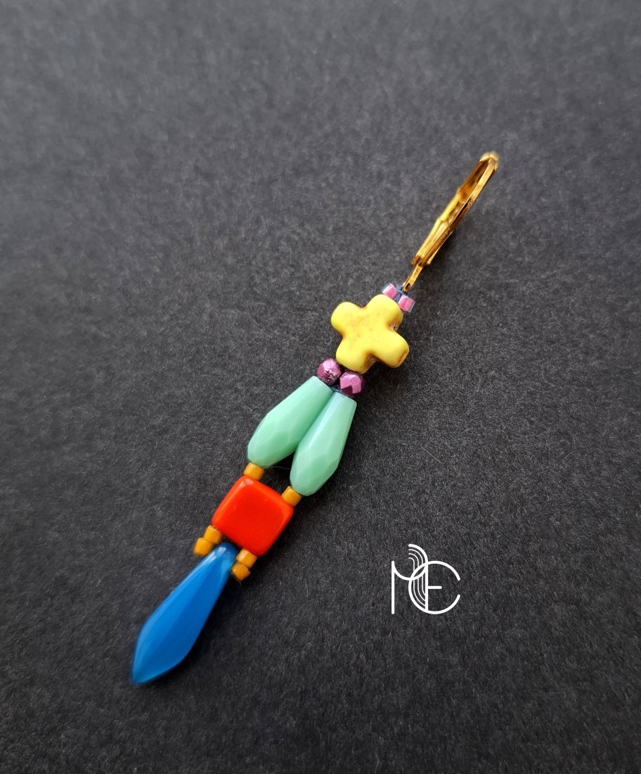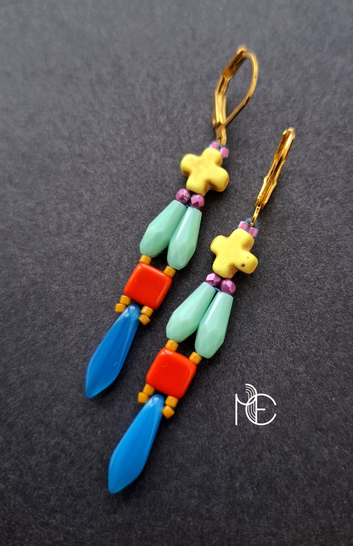 Kolczyki wiszące, wykonane techniką swoistego haftu drobnymi, szklanymi koralikami w połączeniu z żółtymi howlitami. Dwustronne, podwieszone na pozłacanych i nieuczulających biglach typy angielskiego. Wymiary - długość wraz z zapięciem: 6 cm, szerokość max. 8 mm. Wykonane w jedynym egzemplarzu.