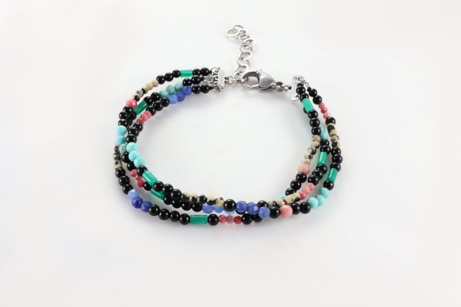 Bransoletka wykonana z trzech sznurów wielobarwnych i różnorodnych kamieni, które harmonijnie komponują się i przyciągają spojrzenia.