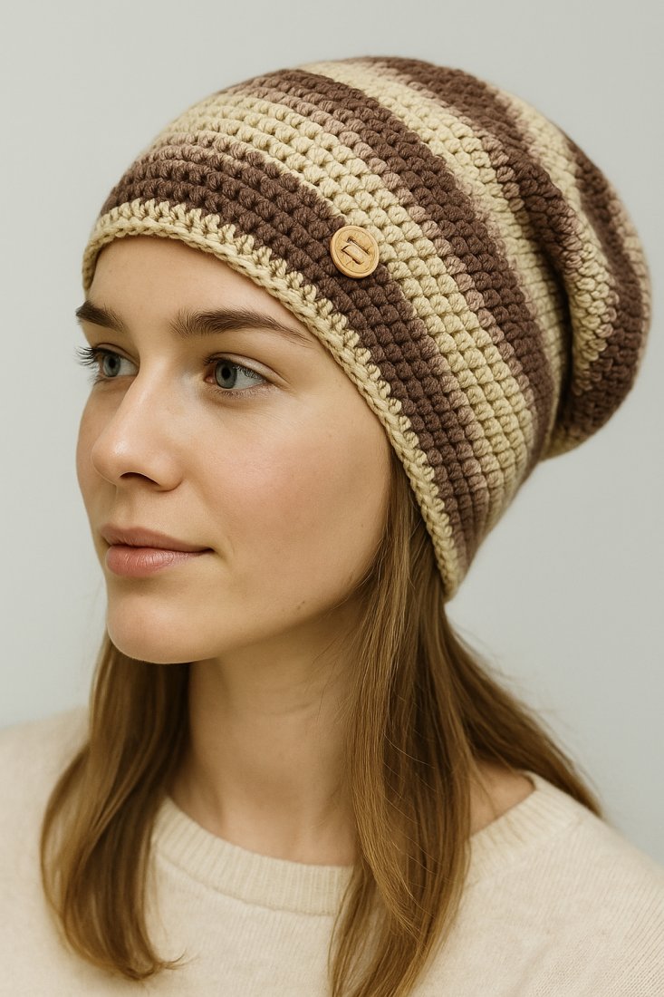 Czapkę wykonałam na szydełku z wysokiej jakości włóczki bawełniano-akrylowej, która zapewnia wygodę noszenia przez cały dzień.