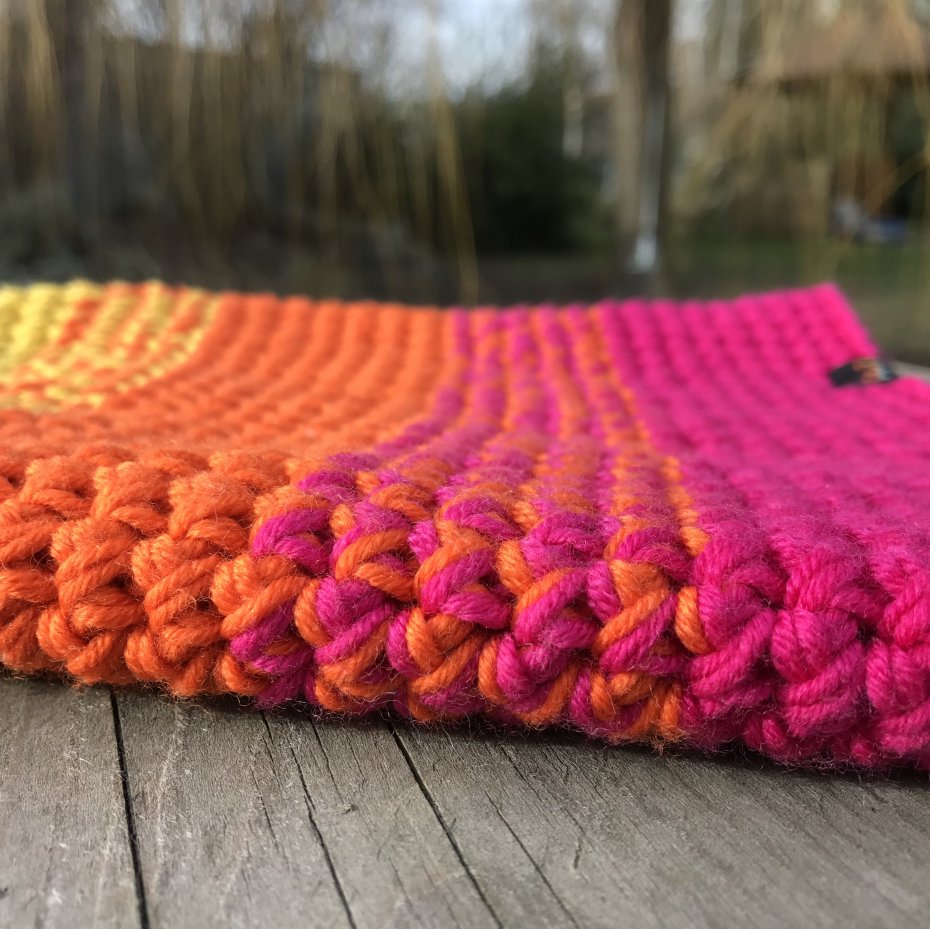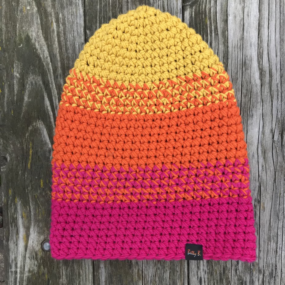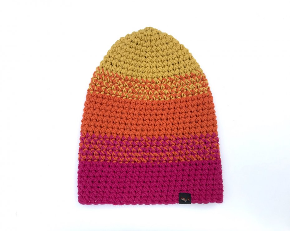 Kolorowa i wyrazista czapka, robiona ręcznie szydełkiem, z najwyższej jakości wełny merino, produkowanej w Europie.