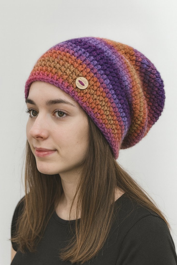 Czapkę wykonałam na szydełku z wysokiej jakości kolorowej włóczki akrylowej, z certyfikatem OEKO-TEX® Standard 100, który potwierdza, że jest bezpieczna dla zdrowia i nie zawiera niebezpiecznych substancji.