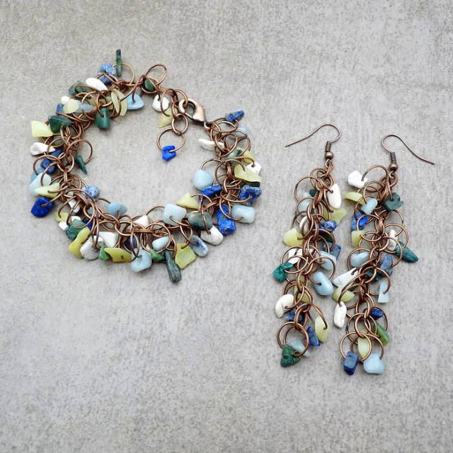 komplet biżuterii: bransoletka i kolczyki wykonane na bazie miedzi z drobnych kamieni lapis lazuli, amazonitu, howlitu białego, nefrytu afrykańskiego i cytrynu podwieszonych na miedzianych kółkach. długość bransoletki jest regulowana: max. 22 cm. waga kolczyka: ok. 7 g, długość całego kolczyka z biglem: ok. 9 cm