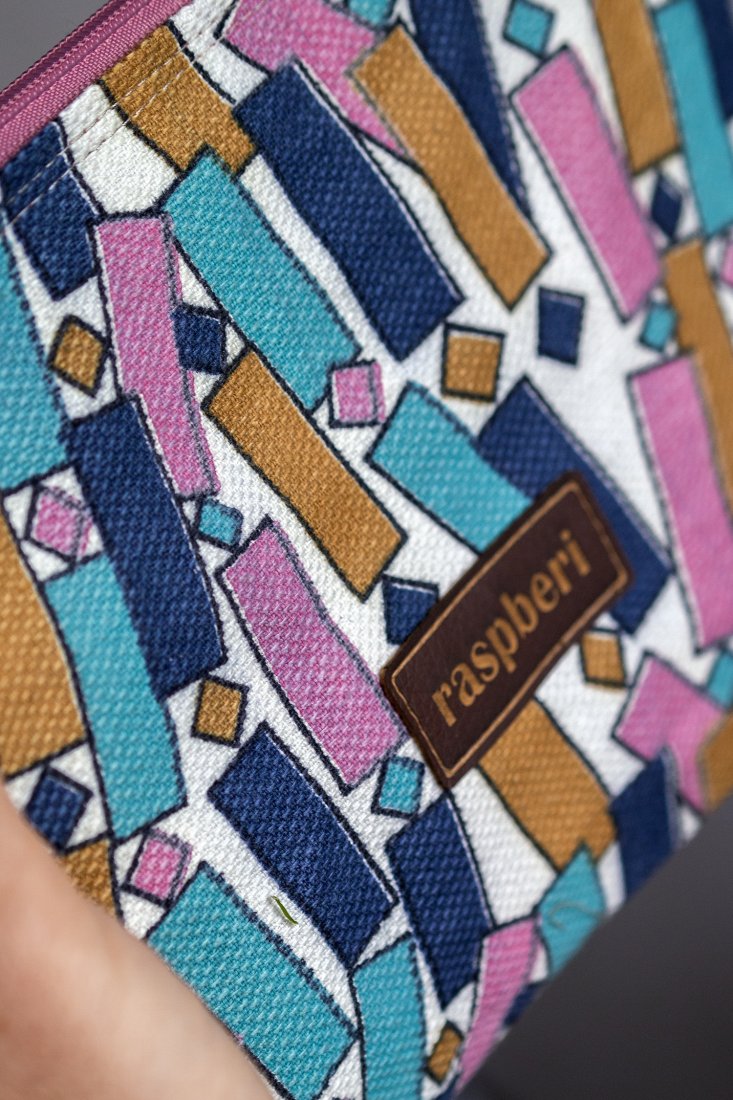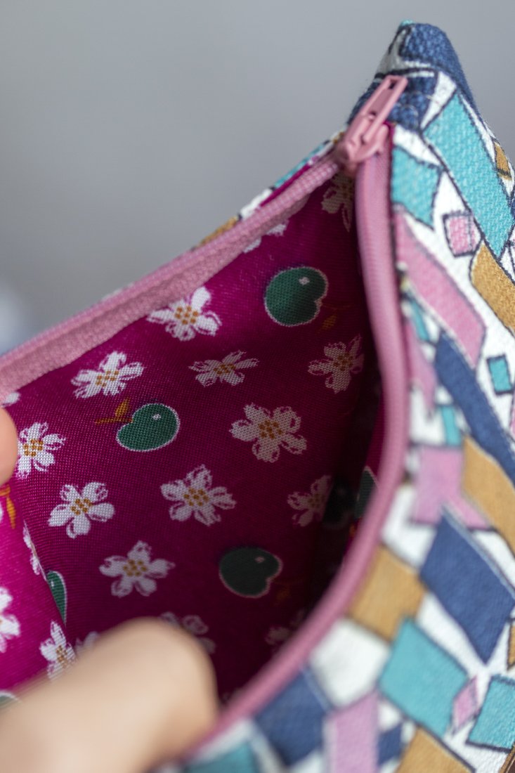 Kosmetyczka jest zapinana na suwak, w środku bawełniana podszewka.