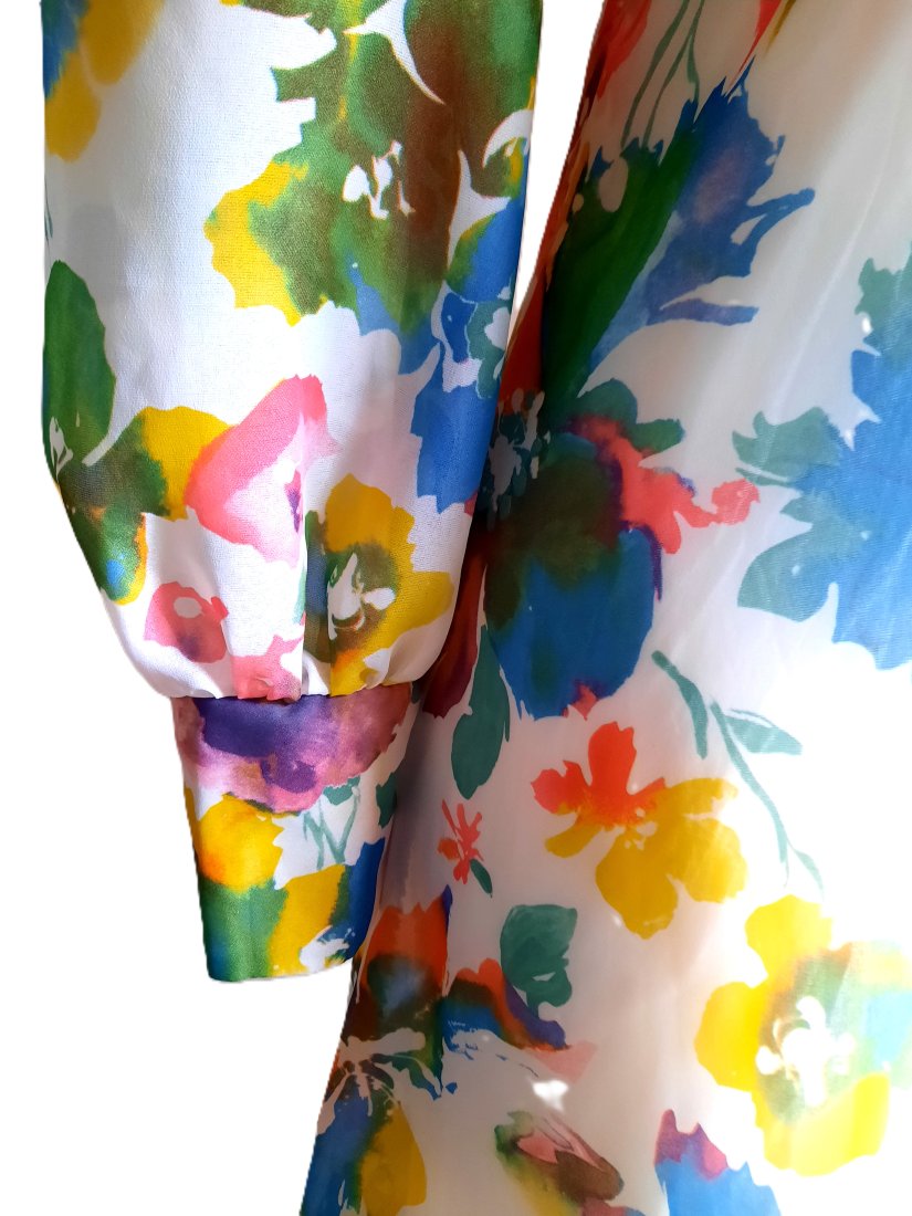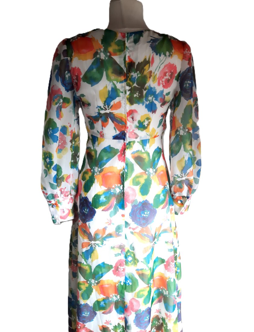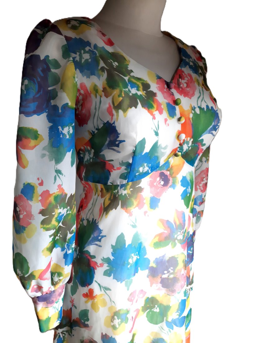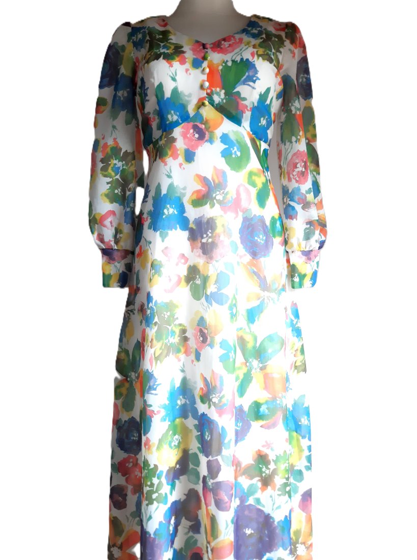 piękna długa sukienka vintage z lat 70-tych w kolorze białym w kolorowe kwiaty, które wyglądają jak namalowane farbami, długi lekko prześwitujący dosyć szeroki rękaw z mankietem zapinanym na dwa guziki, w ramionach małe bufki, poniżej dekoltu ozdobne guziki, sukienka pod biustem odcinana, na plecach zapinana na suwak, na podszewce, brak metki ze składem materiału (cienki, lekki materiał), sukienka jest bardzo długa i będzie dobra na szczupłą i wysoką panią