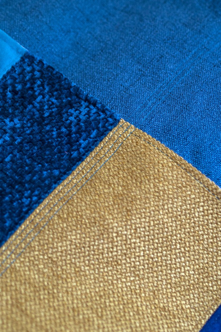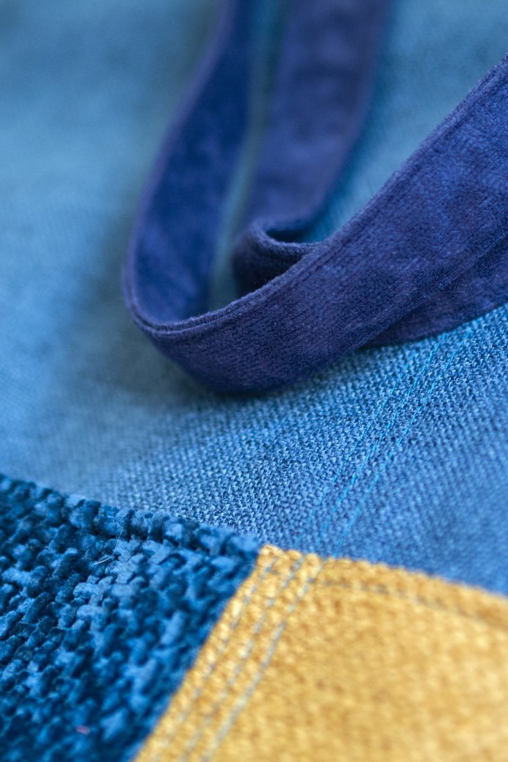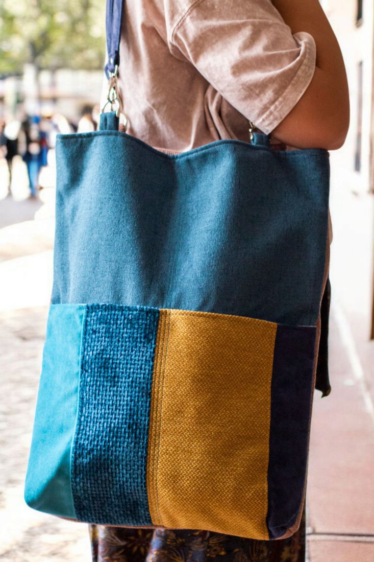 Z przodu dwie kieszenie w stylu patchwork. Całość zapinana na zapięcie magnetyczne.