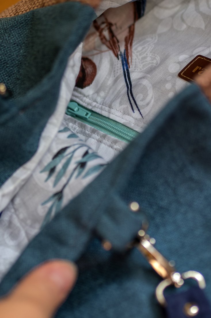 Bawełniana, biała podszewka we wzory, w środku i z tyłu torby kieszonki zapinane na suwak.