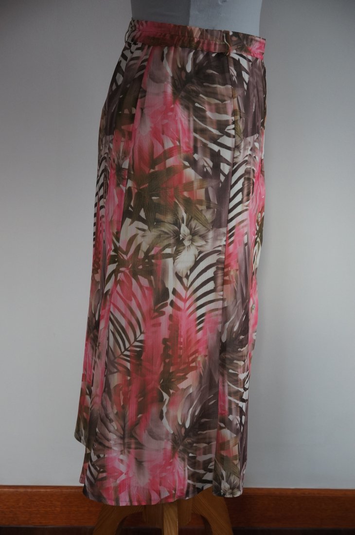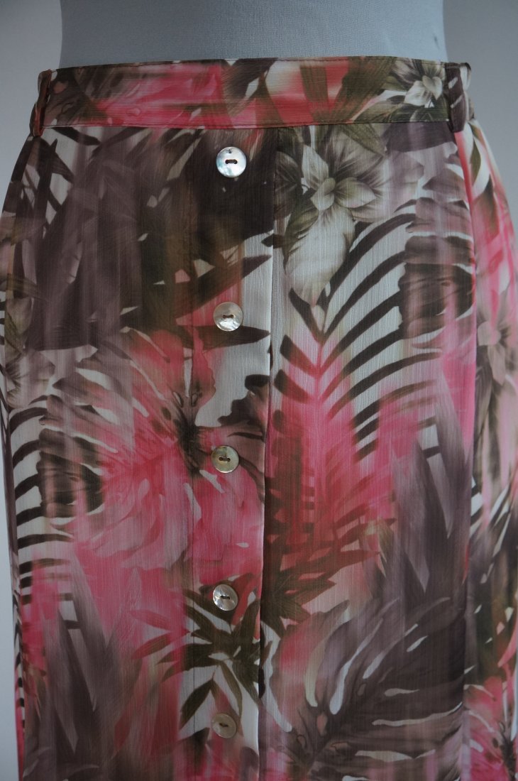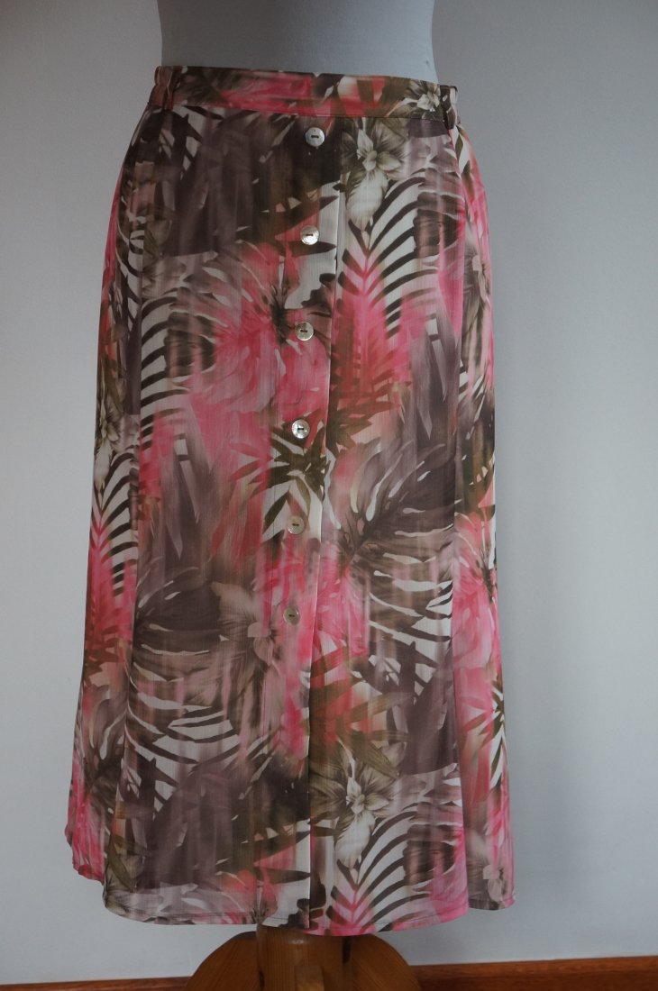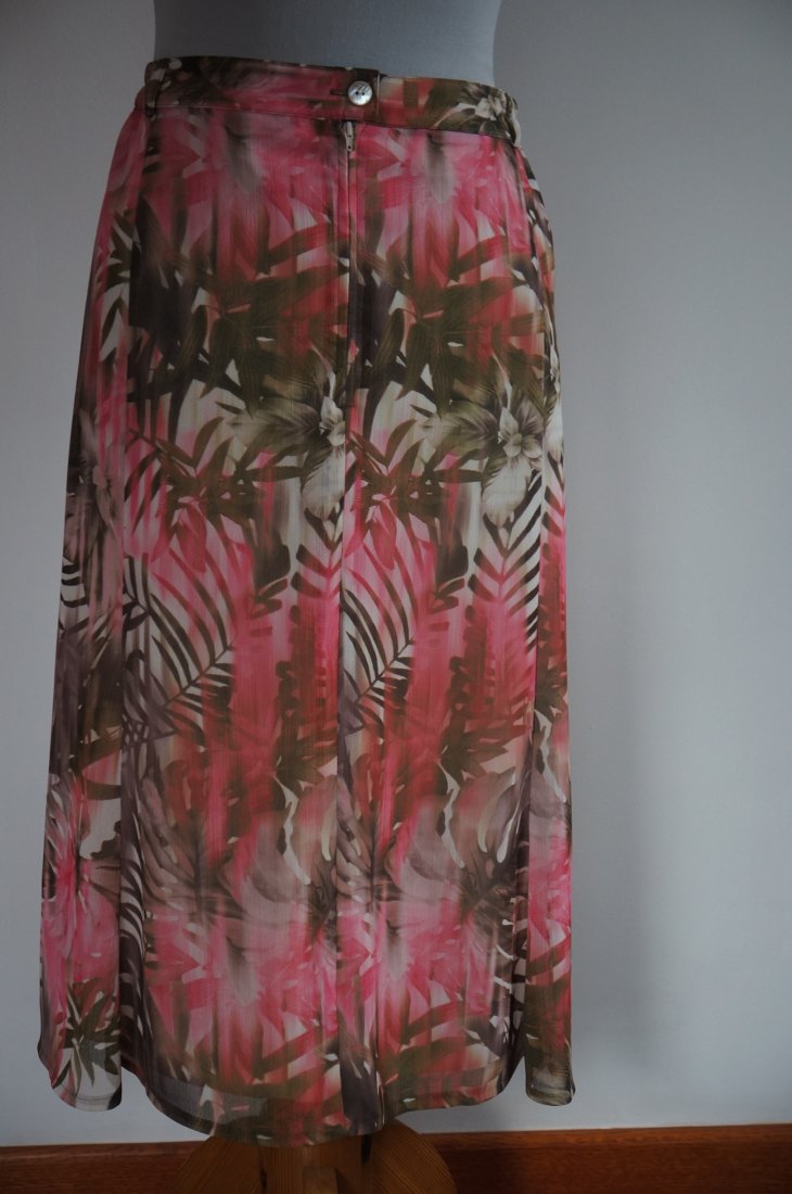 Kolorowa spódnica, cała na podszewce. Z tyłu zapinana na guzik i kryty suwak. Po bokach wszyta delikatna guma. Spódnica ku dołowi rozkloszowana. Przód ozdobiony guzikami. Tkanina poliester. Materiał delikatny, zwiewny. Długość za kolano. Stan bardzo dobry.