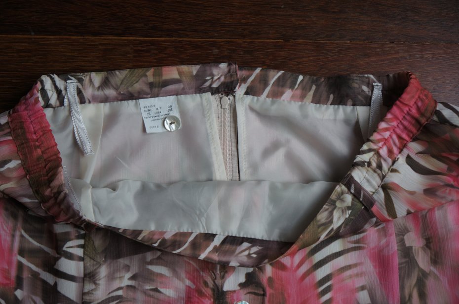 Kolorowa spódnica, cała na podszewce. Z tyłu zapinana na guzik i kryty suwak. Po bokach wszyta delikatna guma. Spódnica ku dołowi rozkloszowana. Przód ozdobiony guzikami. Tkanina poliester. Materiał delikatny, zwiewny. Długość za kolano. Stan bardzo dobry.