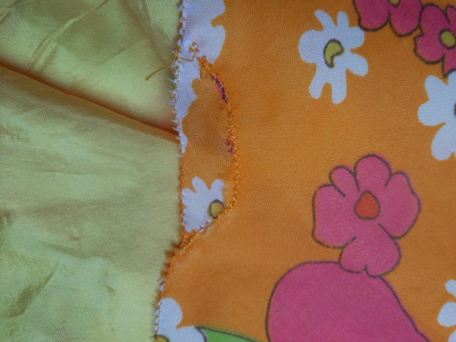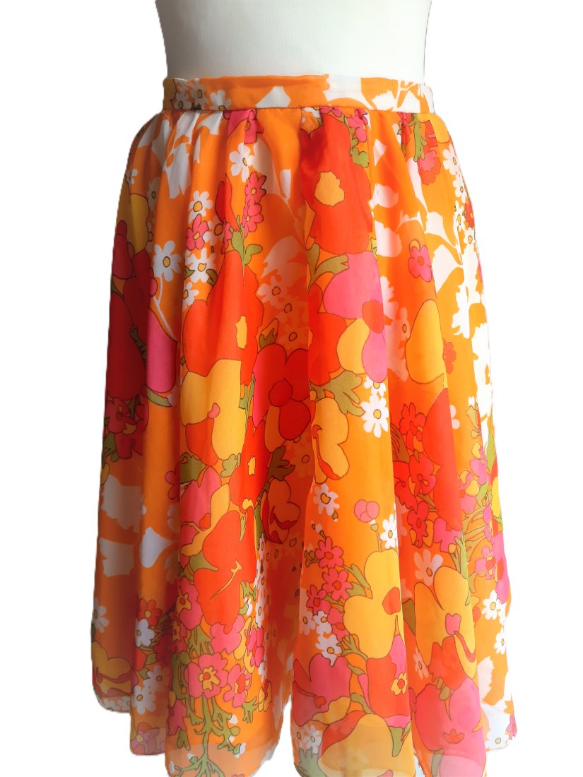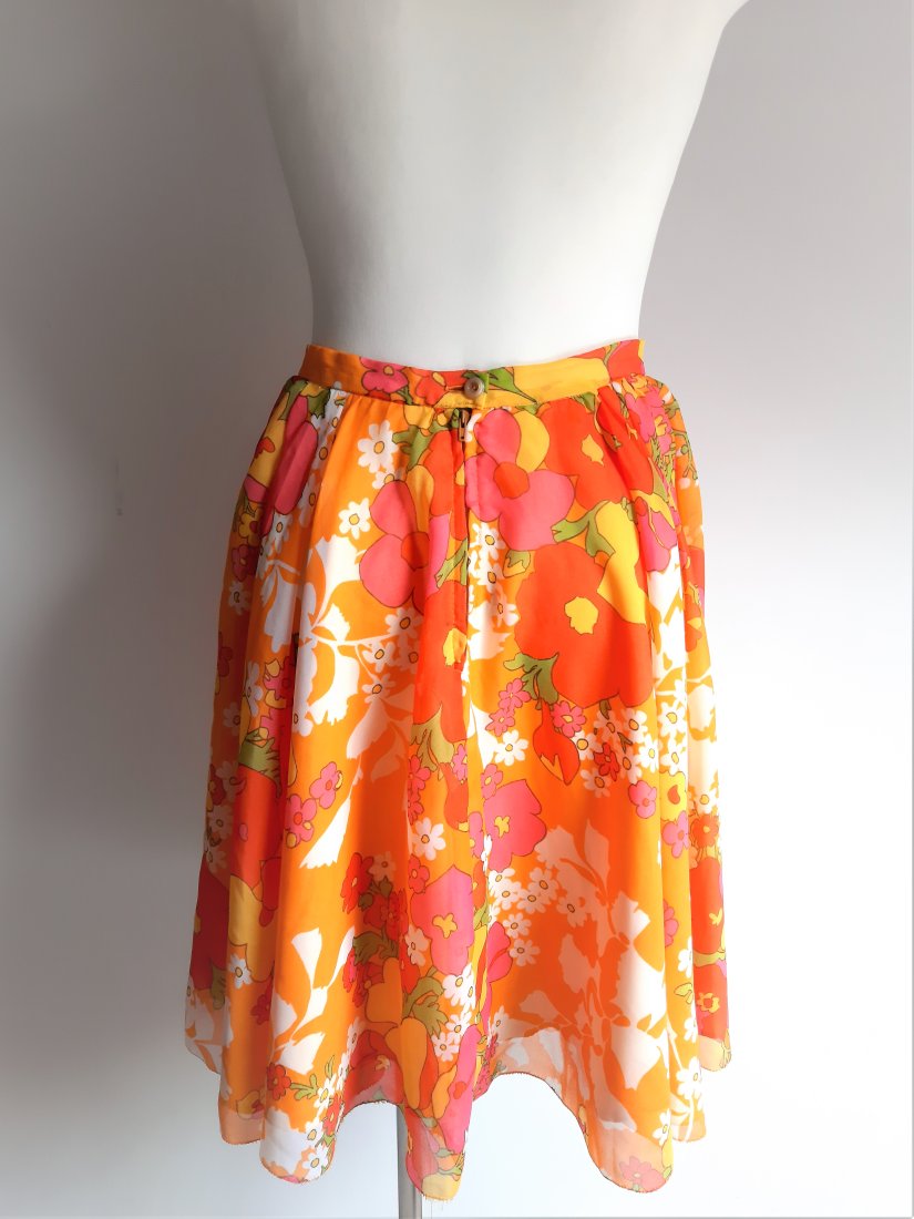 piękna letnia krótka spódnica vintage z lat 70-tych w żywych kolorach, kwiatowy motyw, rozkloszowana, z marszczeniami, cienki, prześwitujący materiał, pod spodem żółta podszewka, zapinana z tyłu na suwak i guzik, długość mniej więcej do kolan, brak metki z rozmiarem i składem