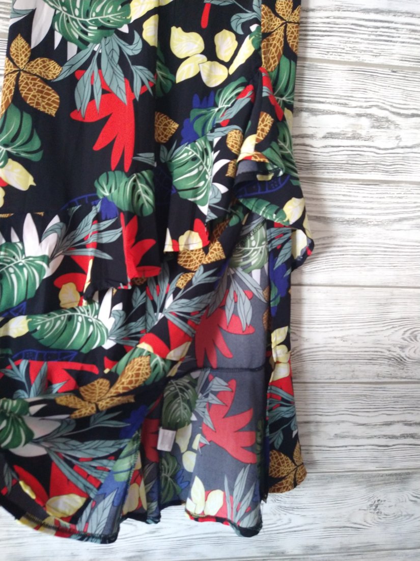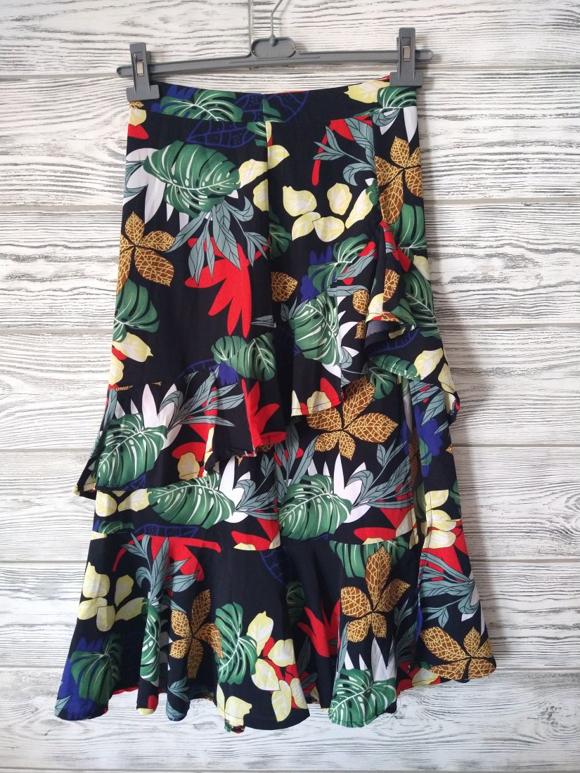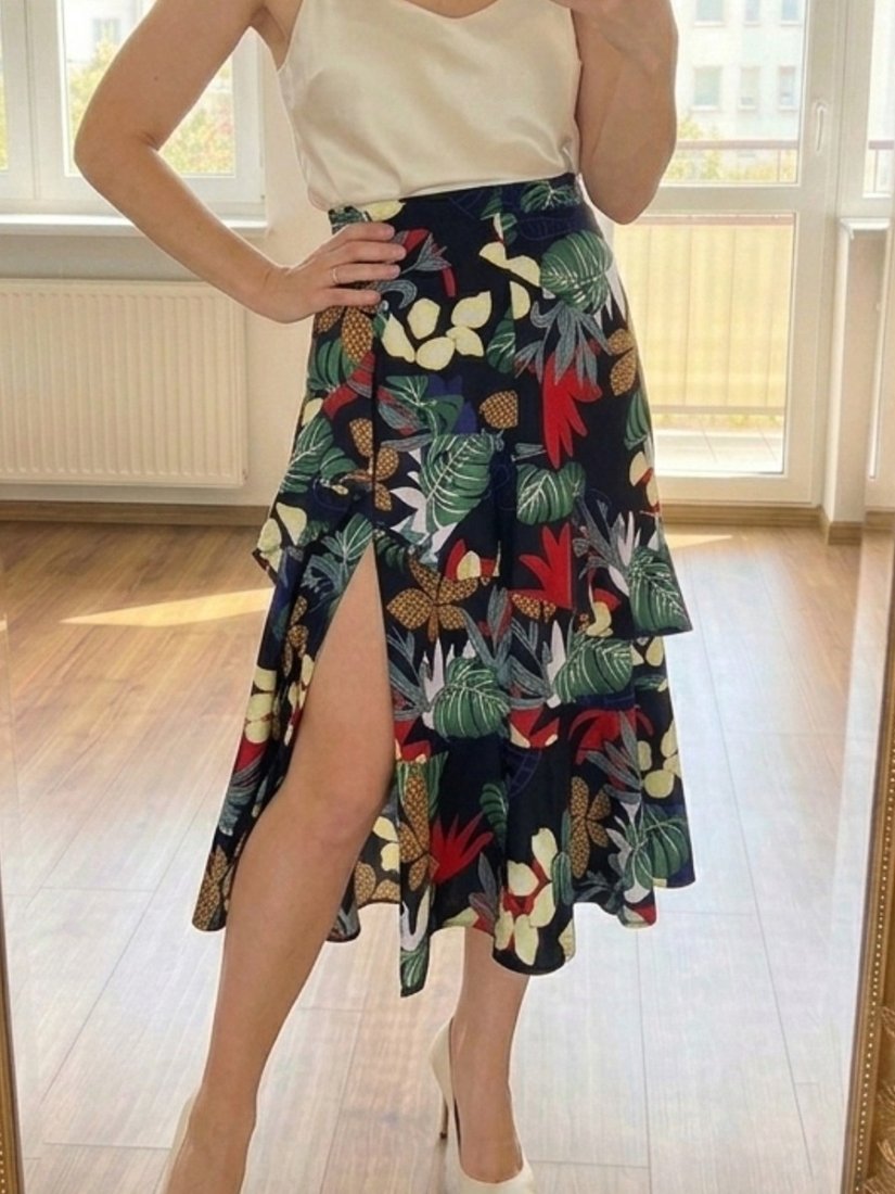 Kolorowa spódnica falbany z rozcięciem na nodze.