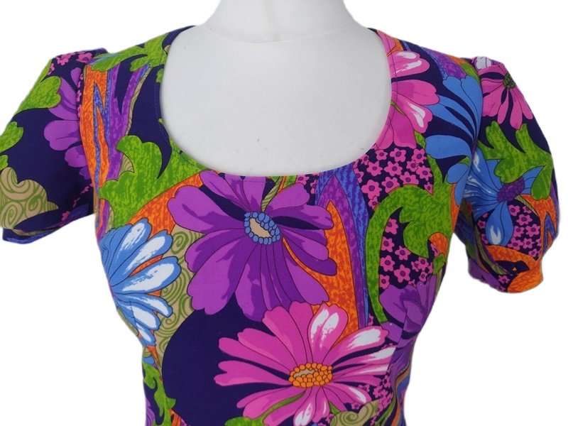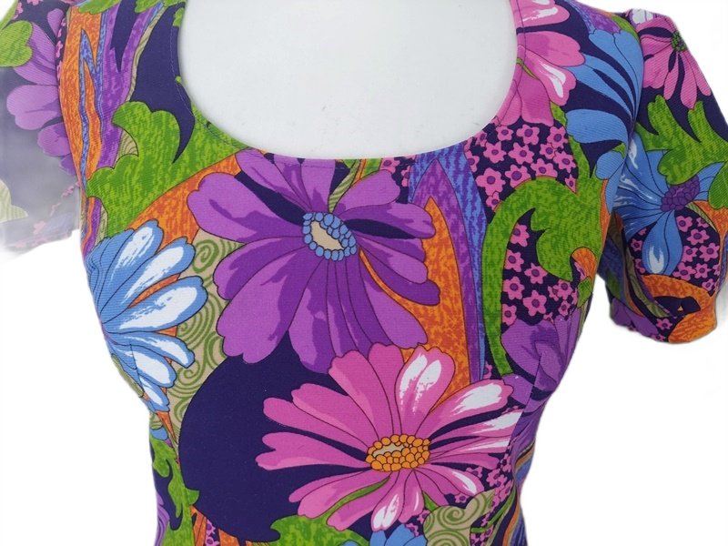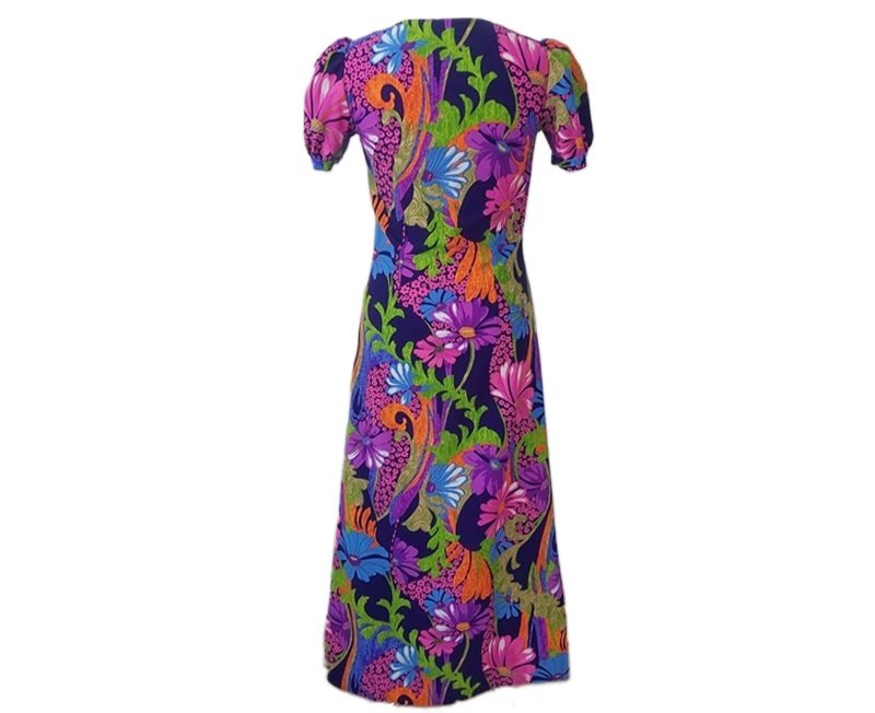To barwna sukienka maxi vintage pełna energii i życia. Intensywne kolory oraz charakterystyczne wzory sprawiają, że jest idealnym wyborem dla osób kochających wyrazisty, radosny styl. Idealna na imprezy tematyczne.