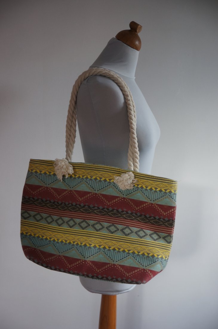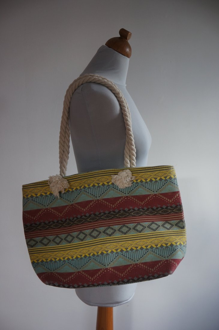 Duża, materiałowa torba. Jednokomorowa. Zapinana od góry na zamek. Wewnątrz podszewka z kieszonką na zamek. Długość uchwytów pozwala nosić ją zarówno w ręku jak i na ramieniu. Stan dobry.