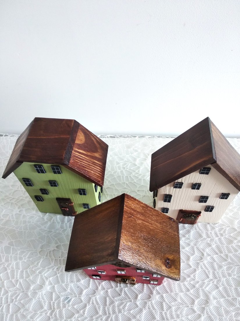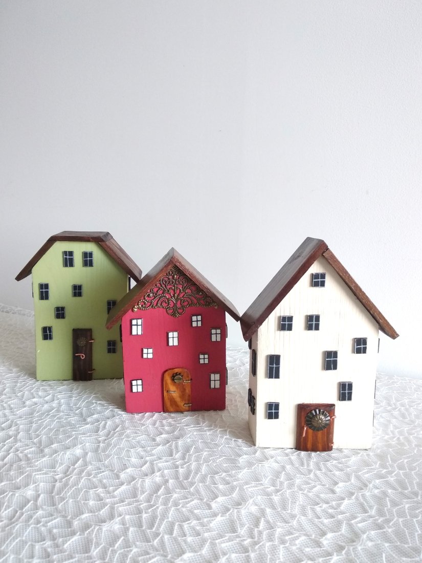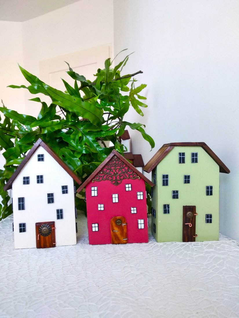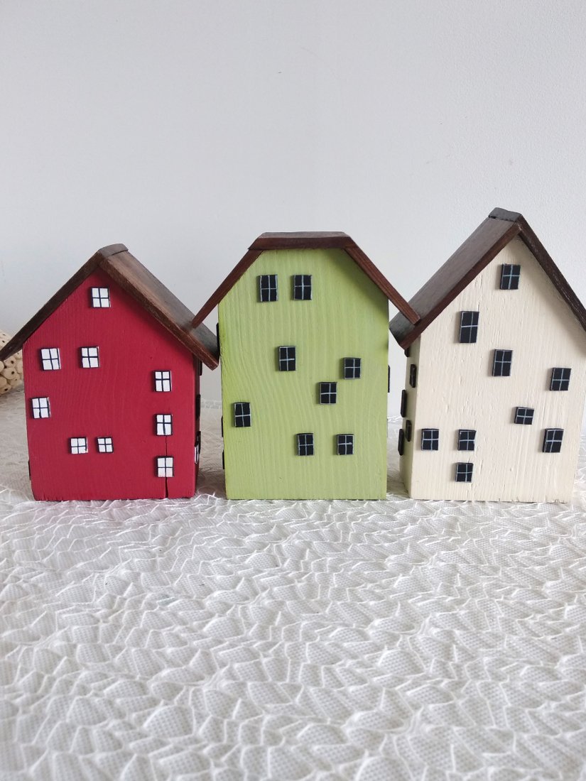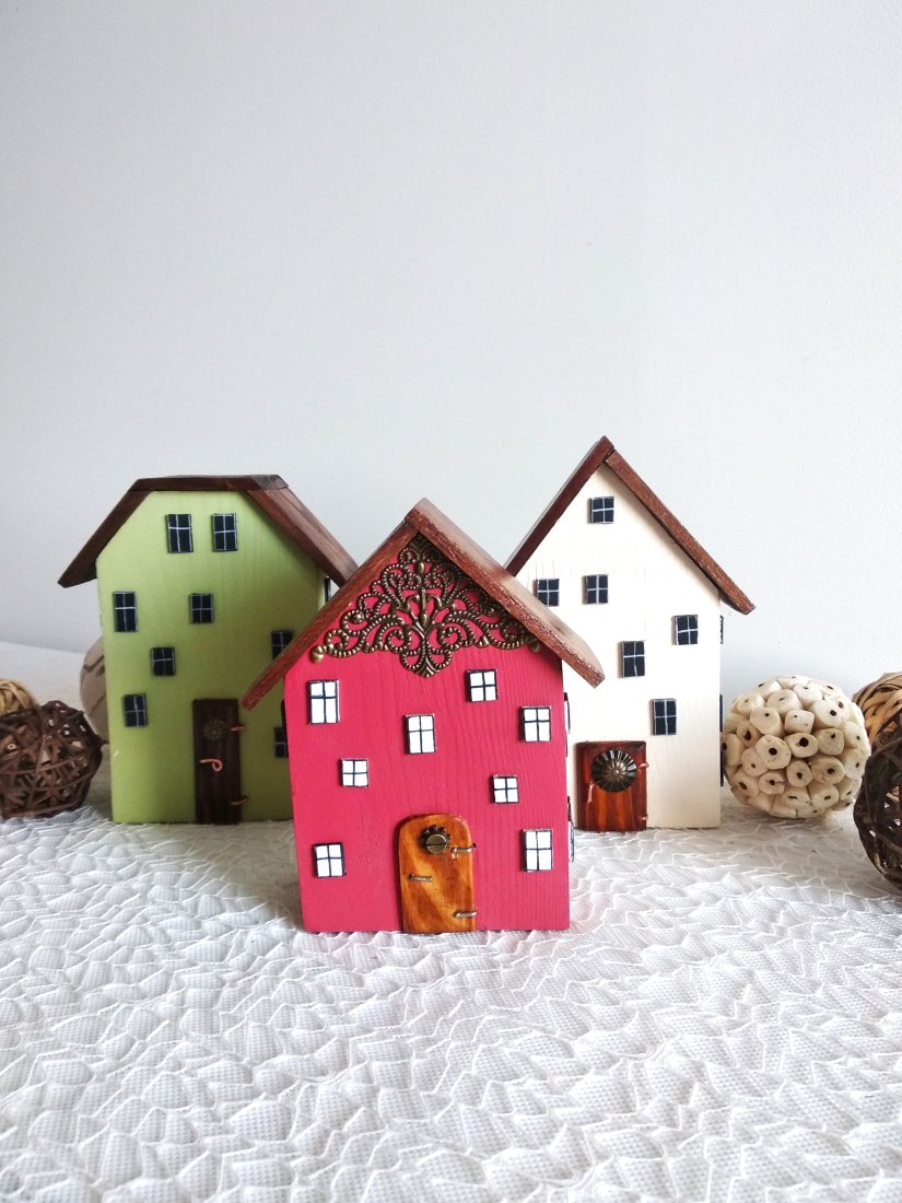 Tagi: #dekoracja pokoju, #drewniane domki dekoracyjne, #ozdobne rękodzieło, #żółte domki drewniane