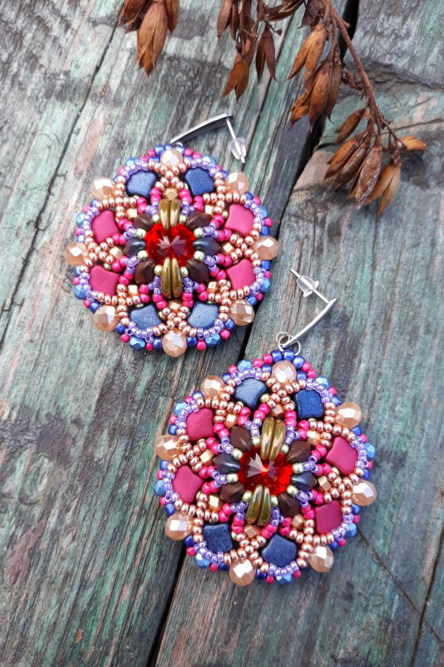 ,,kolorowe ażurowe,, to kolczyki w kształcie rozetek wykonane ze szklanych koralików i kryształków w różnych odcieniach beżu, złota, granatu i czerwieni. Kolczyki zawieszone są na ozdobnych biglach typu sztyft wykonanych ze stali szlachetnej.