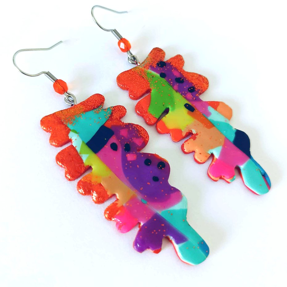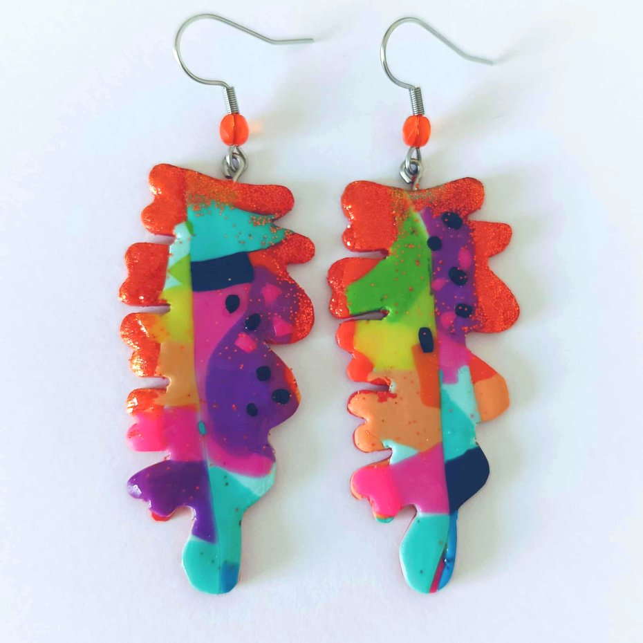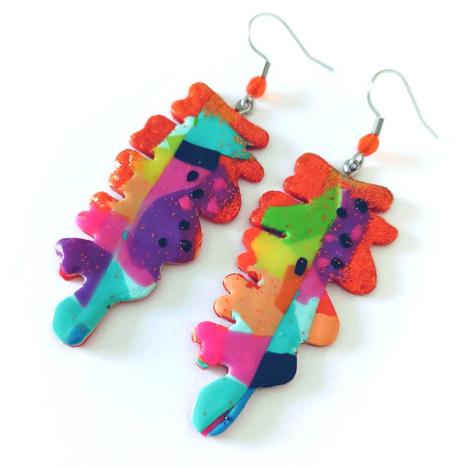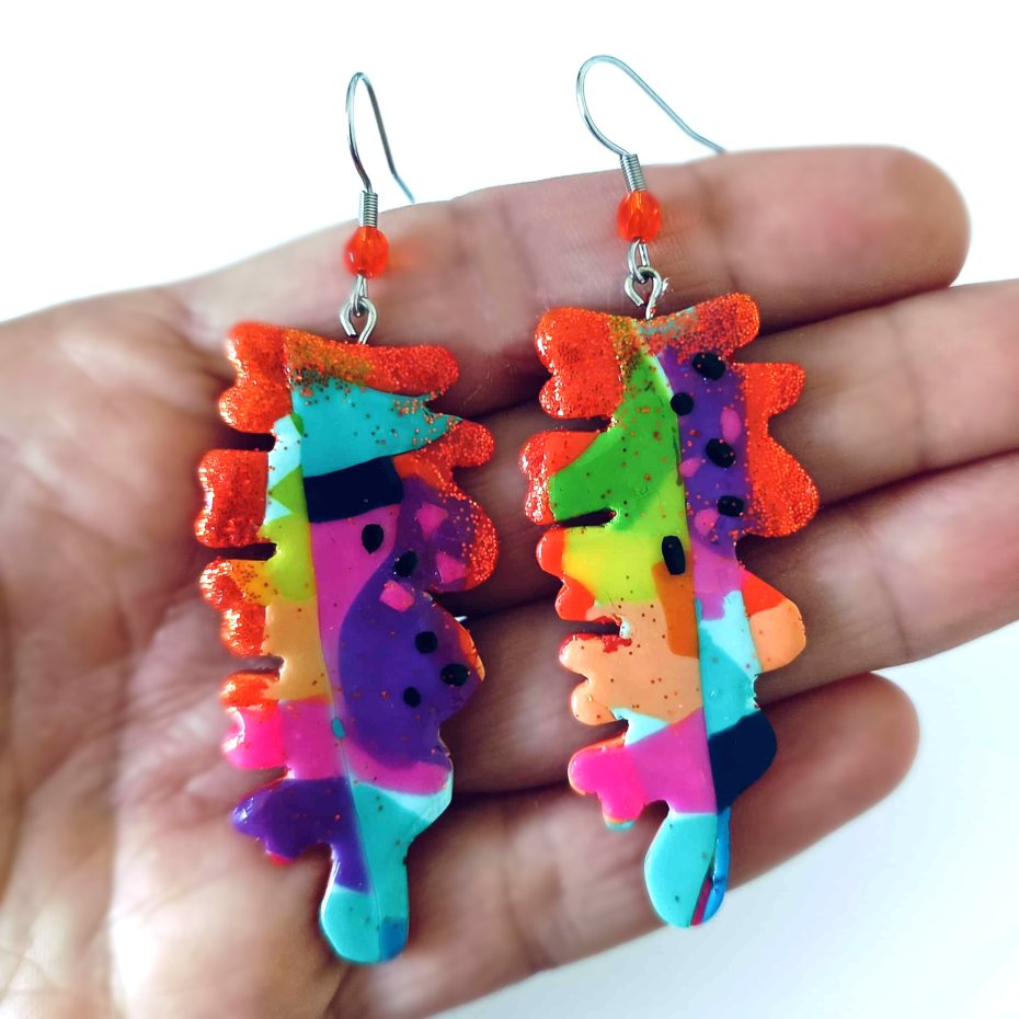 Ręcznie wykonane kolczyki z masy polimerowej w kształcie fantazyjnych liści. Połączenie intensywnych kolorów i czerwonego brokatu nadaje im energetyczny, radosny charakter. Kolczyki są lekkie i wygodne w noszeniu – idealne na co dzień, do imprezowych i letnich stylizacji lub jako wyjątkowy prezent dla osoby, która lubi wyrazistą, ręcznie robioną biżuterię.