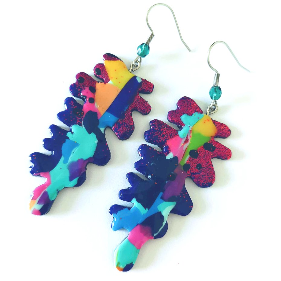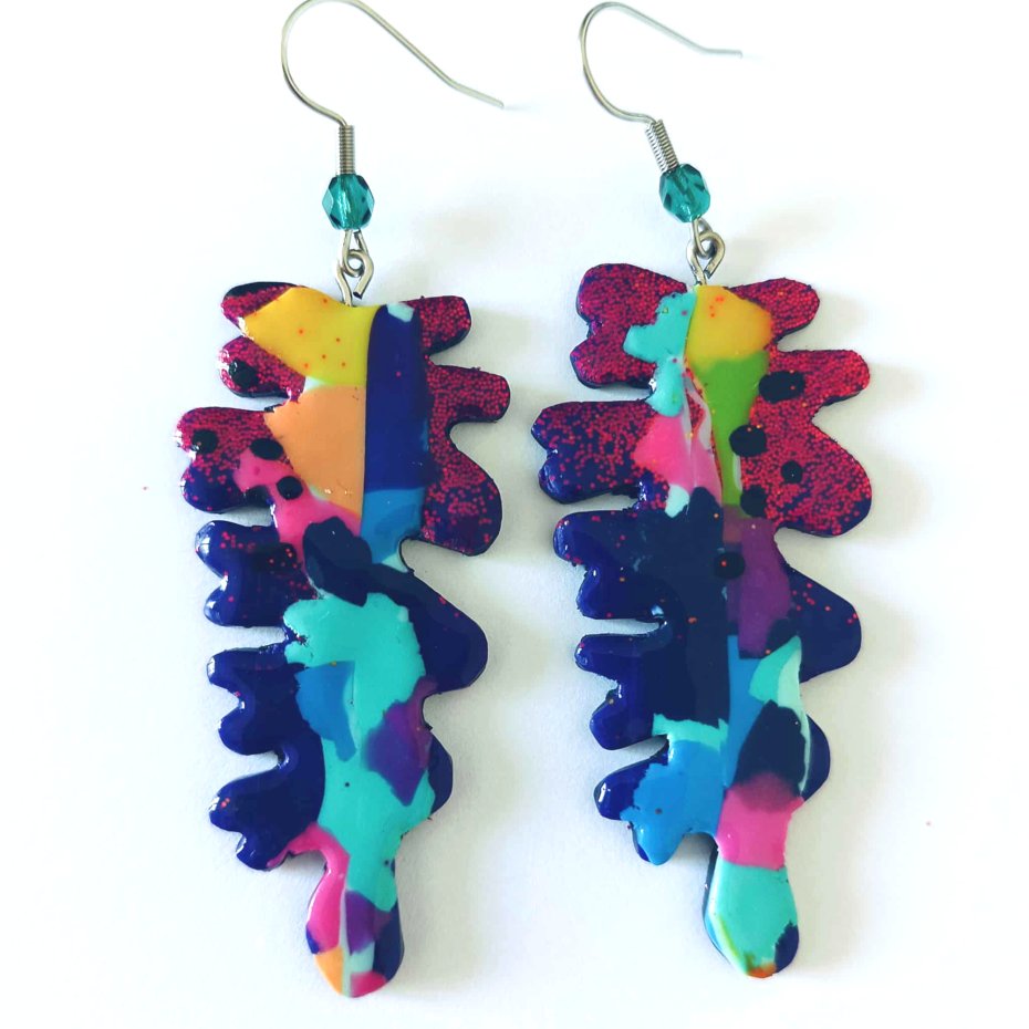 Ręcznie wykonane kolczyki z masy polimerowej w kształcie fantazyjnych liści. Połączenie intensywnych kolorów i różowego brokatu nadaje im energetyczny, radosny charakter. Kolczyki są lekkie i wygodne w noszeniu – idealne na co dzień, do imprezowych i letnich stylizacji lub jako wyjątkowy prezent dla osoby, która lubi wyrazistą, ręcznie robioną biżuterię.