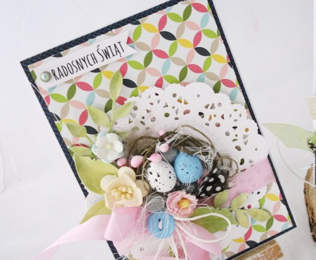 Kolorowa i radosna kartka wielkanocna z gniazdkiem pełnym przepiórczych jajek.