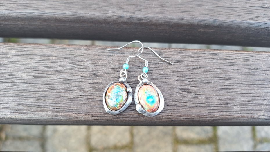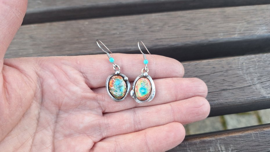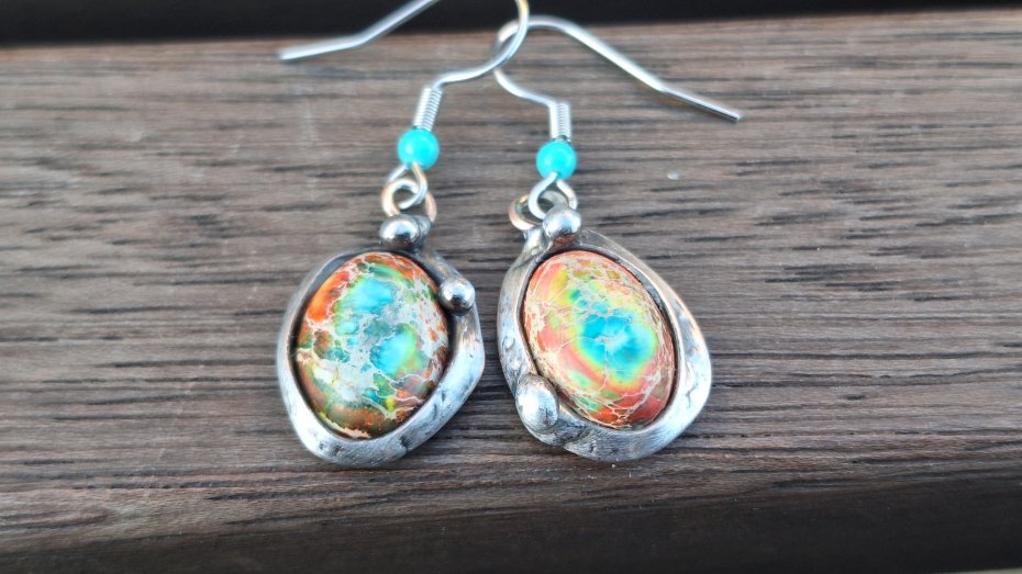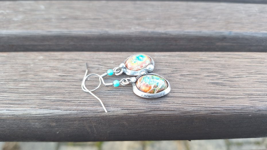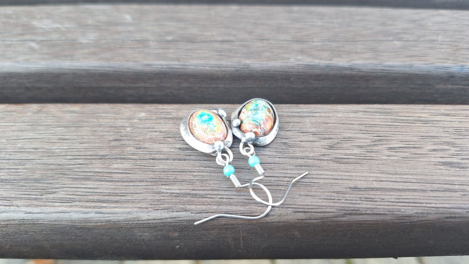 Kolczyki wykonane z miedzi, cyny i jaspisów. Długość ok. 4 cm z biglem. Kolczyki nie są idealnie równe. Bigle metalowe.