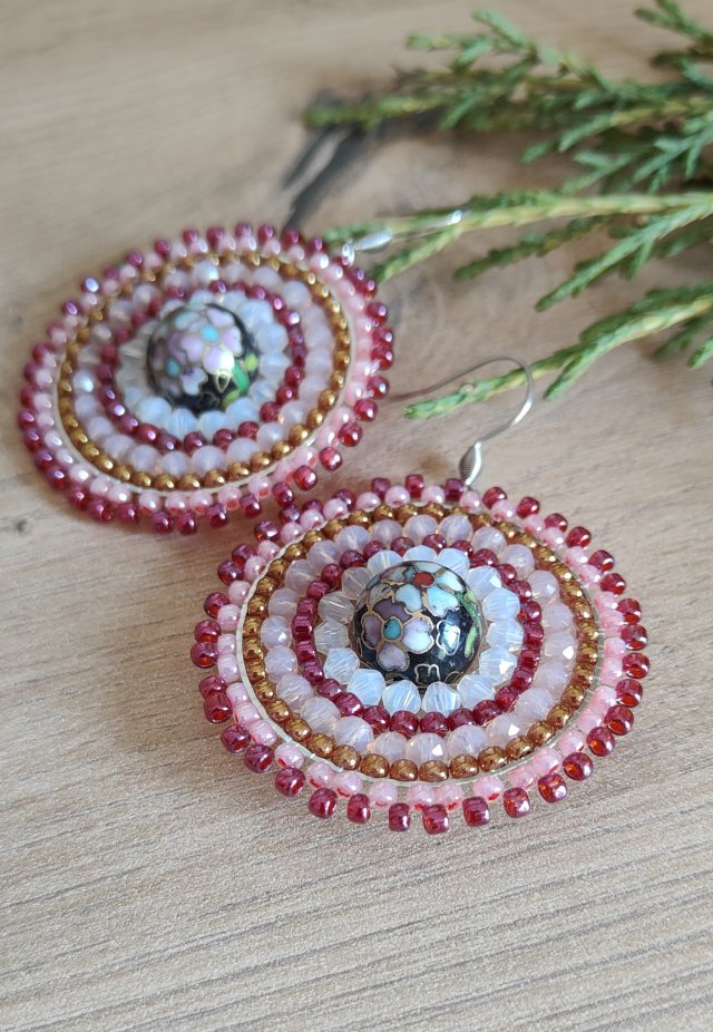 ,, kolorowe koła,, to kolczyki wykonane na obręczach ze szklanych koralików i kryształków w różnych odcieniach czerwieni, bieli, różu i złota. Kolczyki zawieszone są na klasycznych biglach wykonanych ze stali szlachetnej.