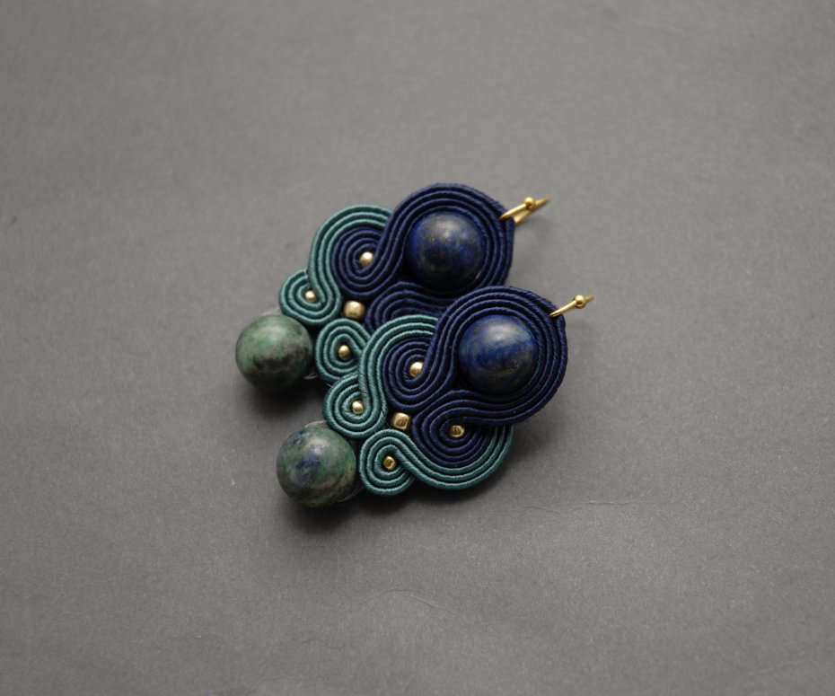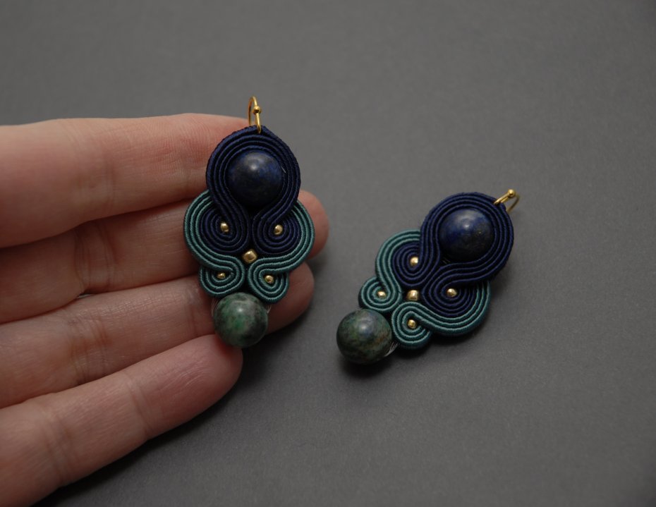 Oferuję kolczyki zrobione techniką sutasz, ozdobione chryzokolą i drobnymi koralikami