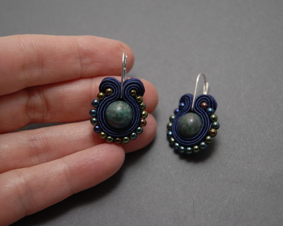 oferuję kolczyki zrobione techniką sutasz, ozdobione chryzokolą i drobnymi koralikami