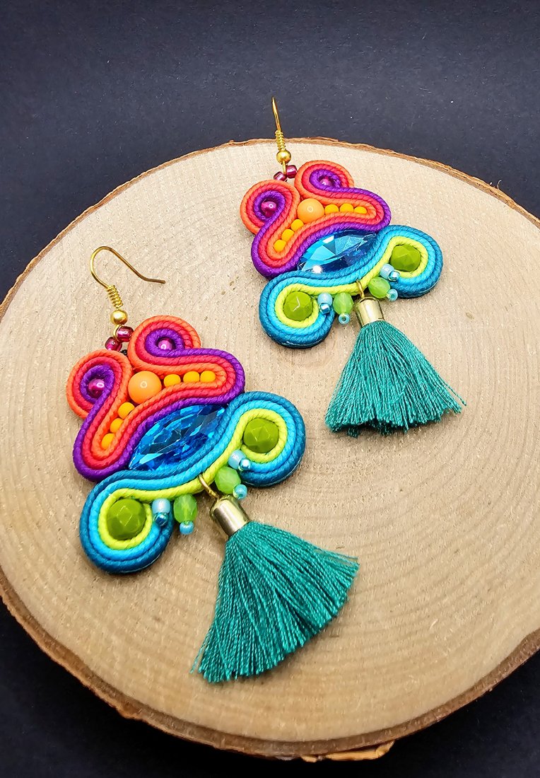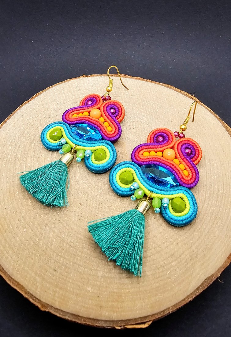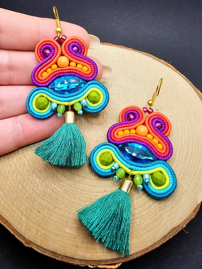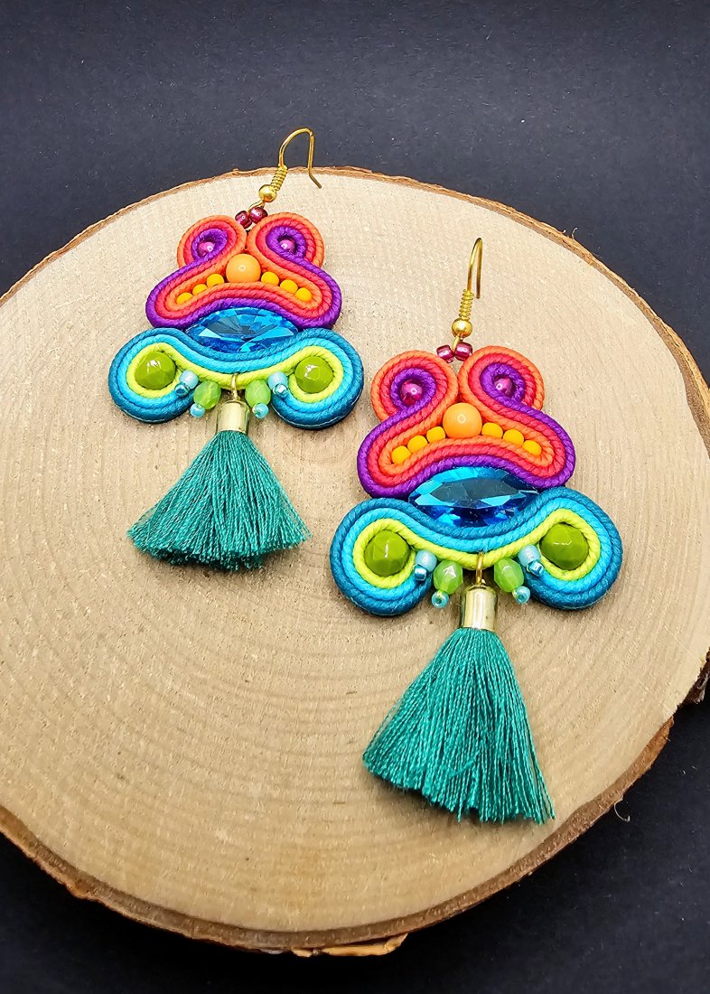 Fasetowane szklane kryształki otoczone polskimi sznurkami sutasz oraz szklanymi czeskimi koralikami. Dół kolczyków zdobią wiszące chwosty oraz szklane koraliki. Kolczyki zamocowane na klasycznych metalowych biglach w kolorze złotym. Kolory w kolczykach: turkusowy, różowy, fioletowy, limonkowy, pomarańczowy.