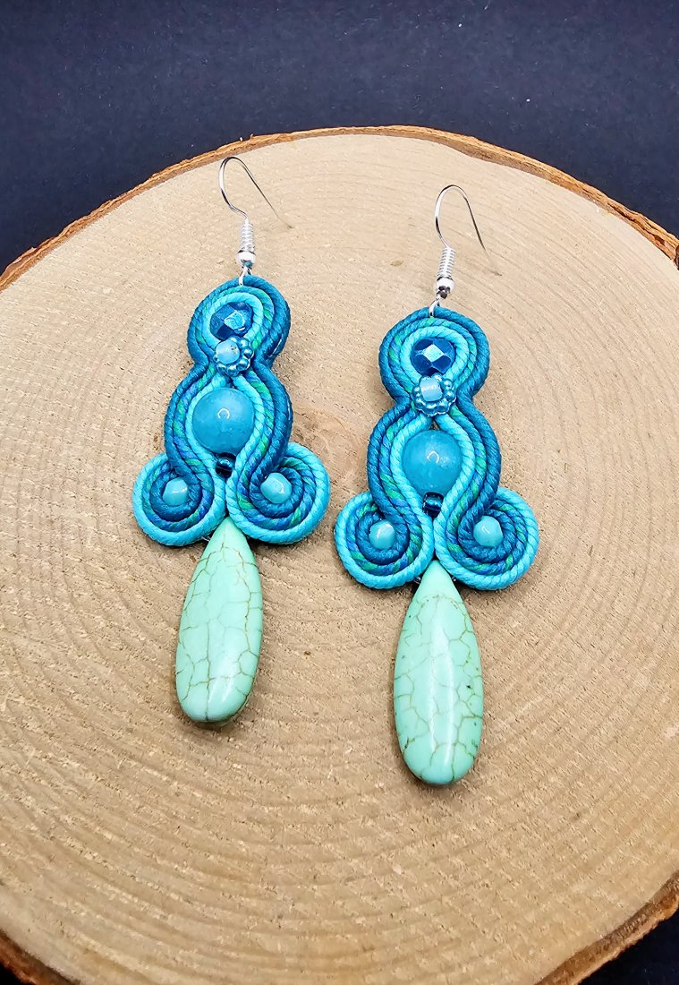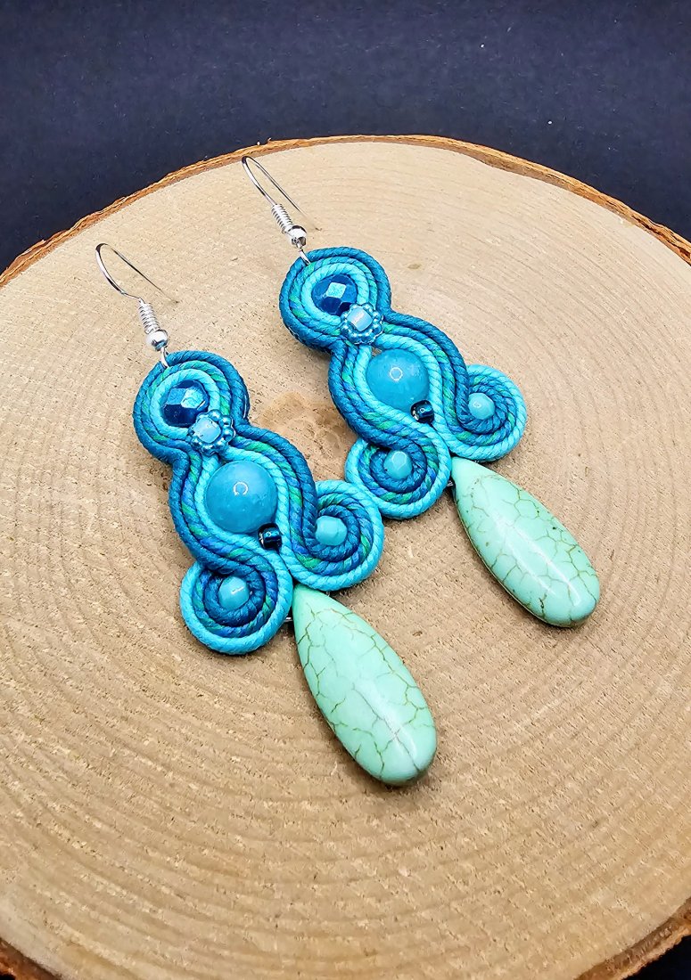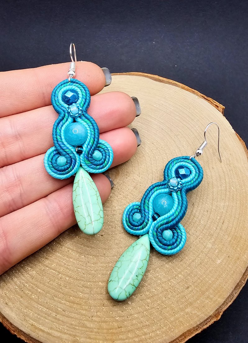 Turkusowe kulki jadeitu otoczone polskimi sznurkami sutasz oraz szklanymi czeskimi i japońskimi koralikami o rożnych kształtach i wielkościach. Dół kolczyków zdobi howlit w kształcie łezki. Kolory w kolczykach: turkusowy, niebieski, zielony Kolczyki zawieszone na klasycznych otwartych biglach w kolorze srebrnym.