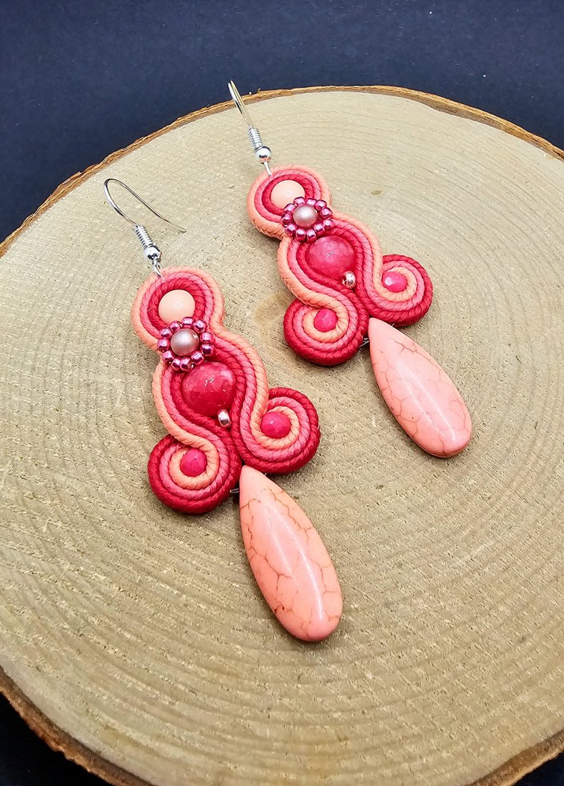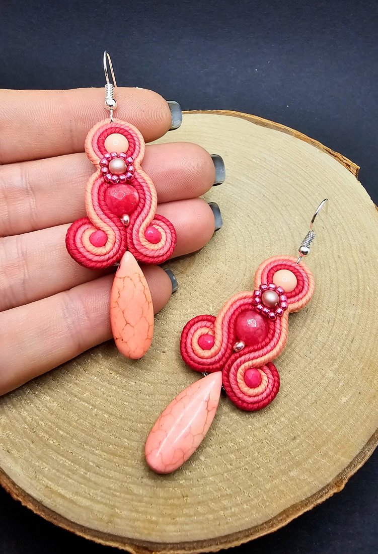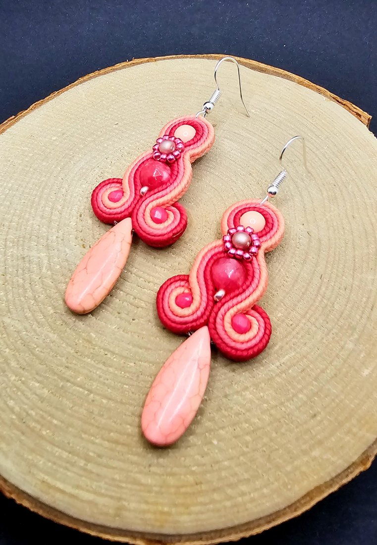Różowe kulki jadeitu otoczone polskimi sznurkami sutasz oraz szklanymi czeskimi i japońskimi koralikami o rożnych kształtach i wielkościach. Dół kolczyków zdobi howlit w kształcie łezki. Kolory w kolczykach: różowy, ciemny różowy i koralowy. Kolczyki zawieszone na klasycznych otwartych biglach w kolorze srebrnym.