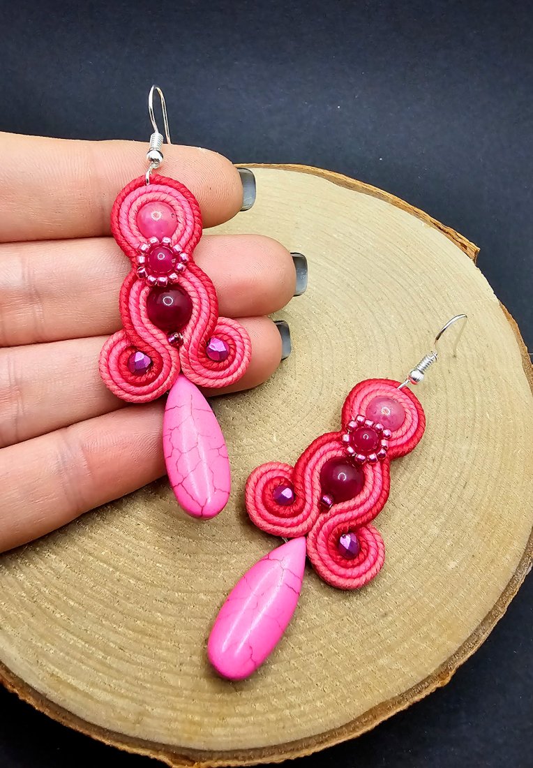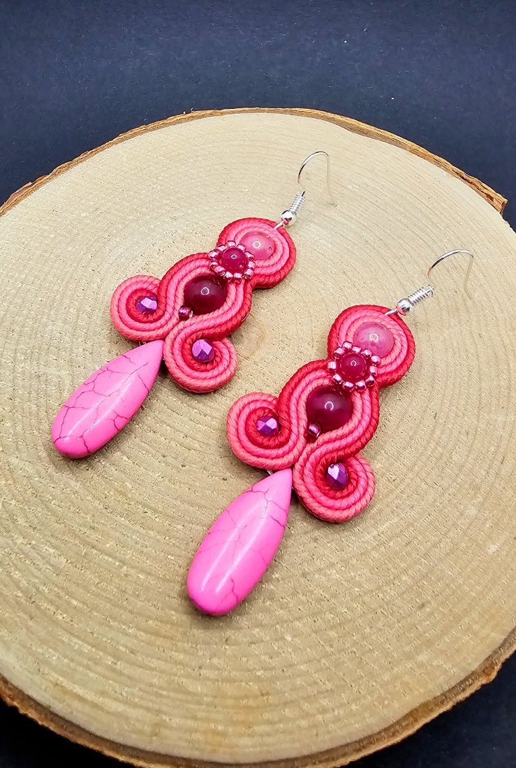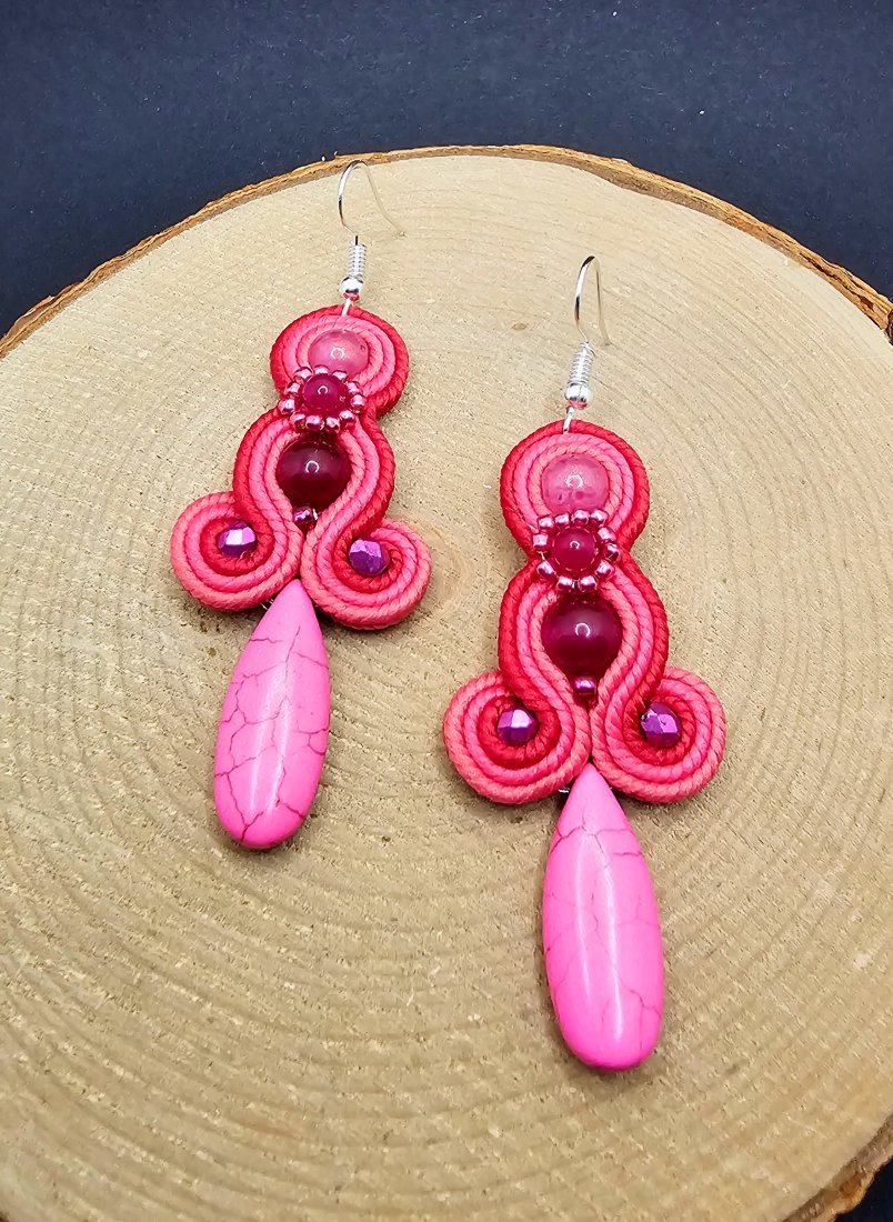 Różowe kulki jadeitu otoczone polskimi sznurkami sutasz oraz szklanymi czeskimi i japońskimi koralikami o rożnych kształtach i wielkościach. Dół kolczyków zdobi howlit w kształcie łezki. Kolory w kolczykach: fuksja, intensywny różowy, różowy. Kolczyki zawieszone na klasycznych otwartych biglach w kolorze srebrnym.