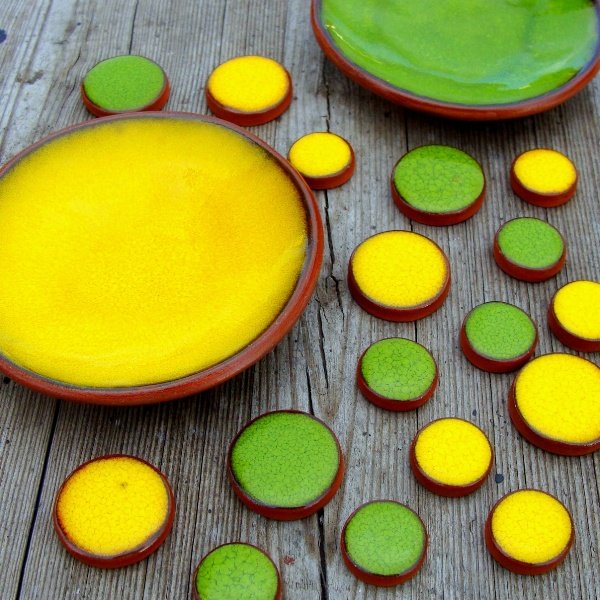Wykonane z brązowej gliny, pokryte bardzo błyszczącymi, efektoeymi szkliwami w soczystych kolorach żółtym i zielonym.