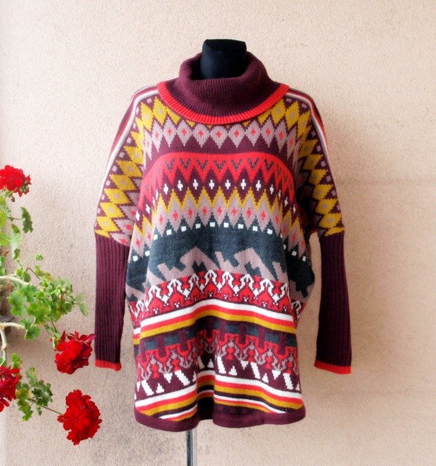 Barwny sweter marki Vila , 15% wełny, 70% akrylu, 15% nylon. Dół lekko zaokrąglony, z boku rozcięcia. Fason oversize, ale chyba sugerowałabym 42. Stan bardzo dobry. Rozmiar z metki L. Na manekinie o rozmiarze 38.