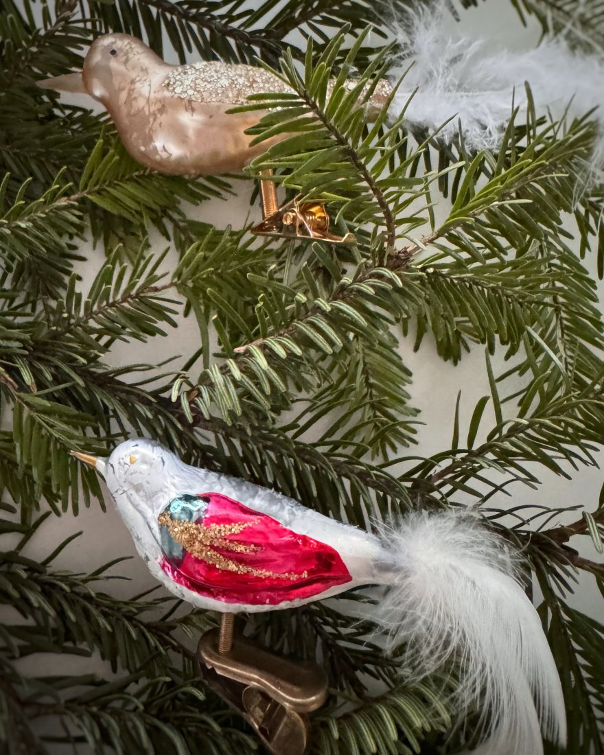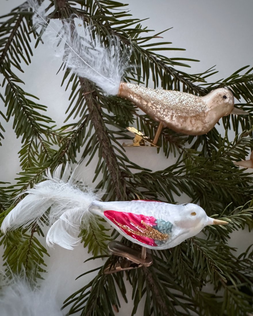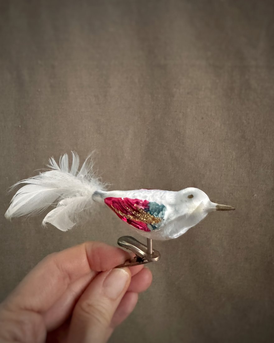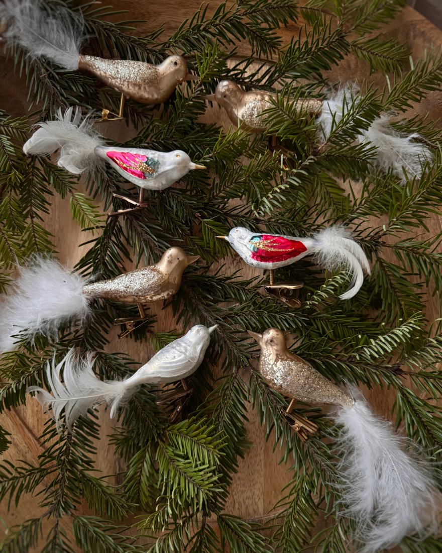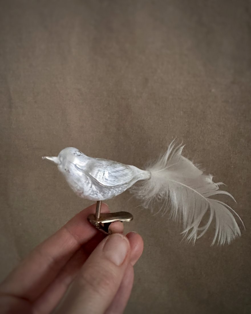 Ozdoby świąteczne na choinkę i nie tylko w kształcie ptaszków. Ptaszki są szklane, ręcznie malowane na kolor biały, z brokatem, mają ogonki z piór a zaczepia się je na ‚żabki’.