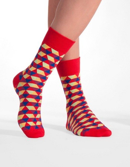My proponujemy fantazyjne połączenie czerwieni, zieleni, fioletu, granatu i żółtego zawarte w unikalnym wzorze. I gwarantujemy, że z tą skarpetką na nodze nie zginiesz w tłumie niczym w tytułowym trójkącie.