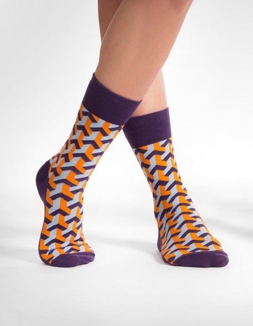 Skarpety o przestrzennym, iluzjonistycznym wzorze, który łączy charakterystyczny kolor fiołka alpejskiego, pomarańcz i delikatny błękit nieba, nadający głębię i wyrazistość. Wzór polecany nie tylko dla ultrasów! Idealnie odnajdzie się nim każdy, kto rozpoczyna swoją przygodę z tańcem, weekendowy imprezowicz i niedzielny spacerowicz.